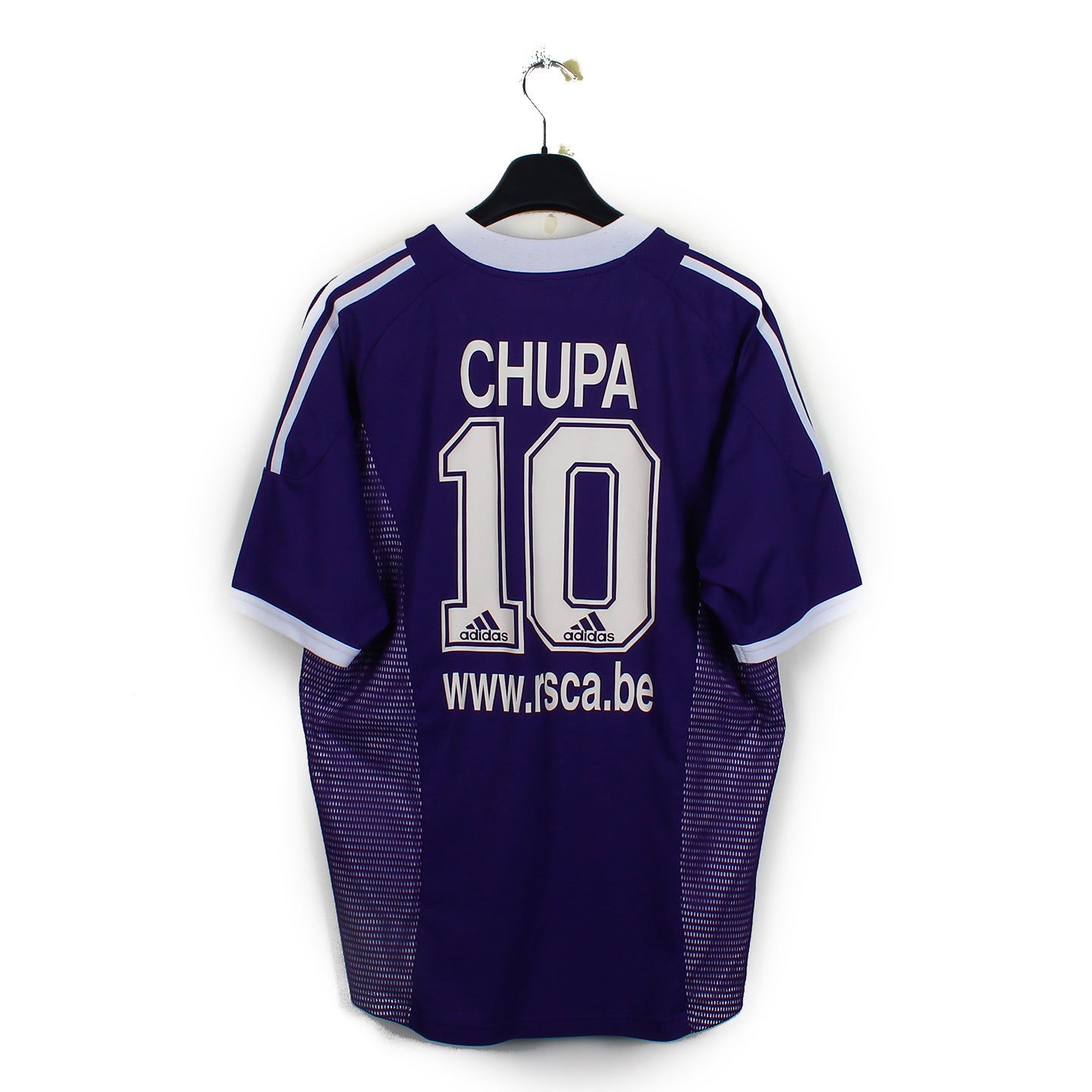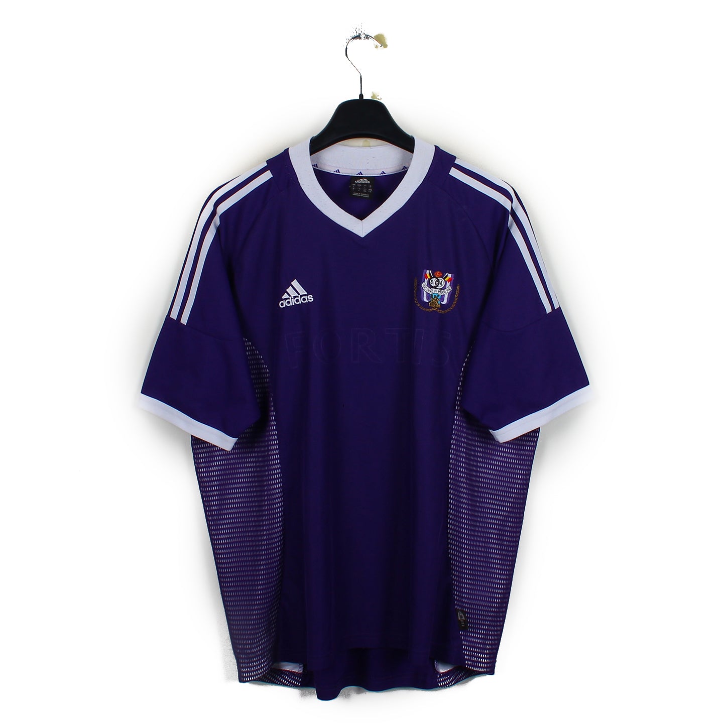 Histoire : Maillot extérieur porté par l'équipe d'Anderlecht lors de la première saison de Hugo Broos à la tête de l'équipe. Après une lutte acharnée face à Bruges, les violets et blancs termineront vice-champion de Belgique.