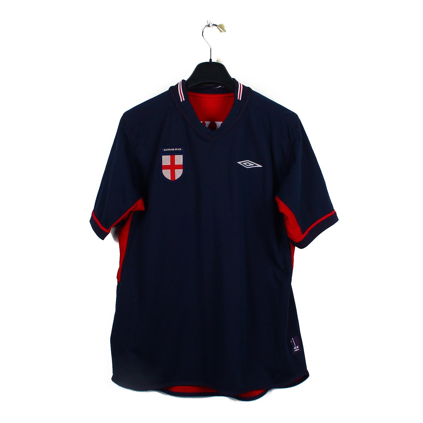 Histoire : Maillot extérieur porté par la sélection des trois lions durant la Coupe du Monde 2002 organisée entre le Japon et la Corée du Sud. Les joueurs menés par leur capitaine David Beckham atteindront les quarts de finale avant d'être éliminés par le Brésil, et ce malgré l'ouverture du score de Michael Owen (défaite 1-2).