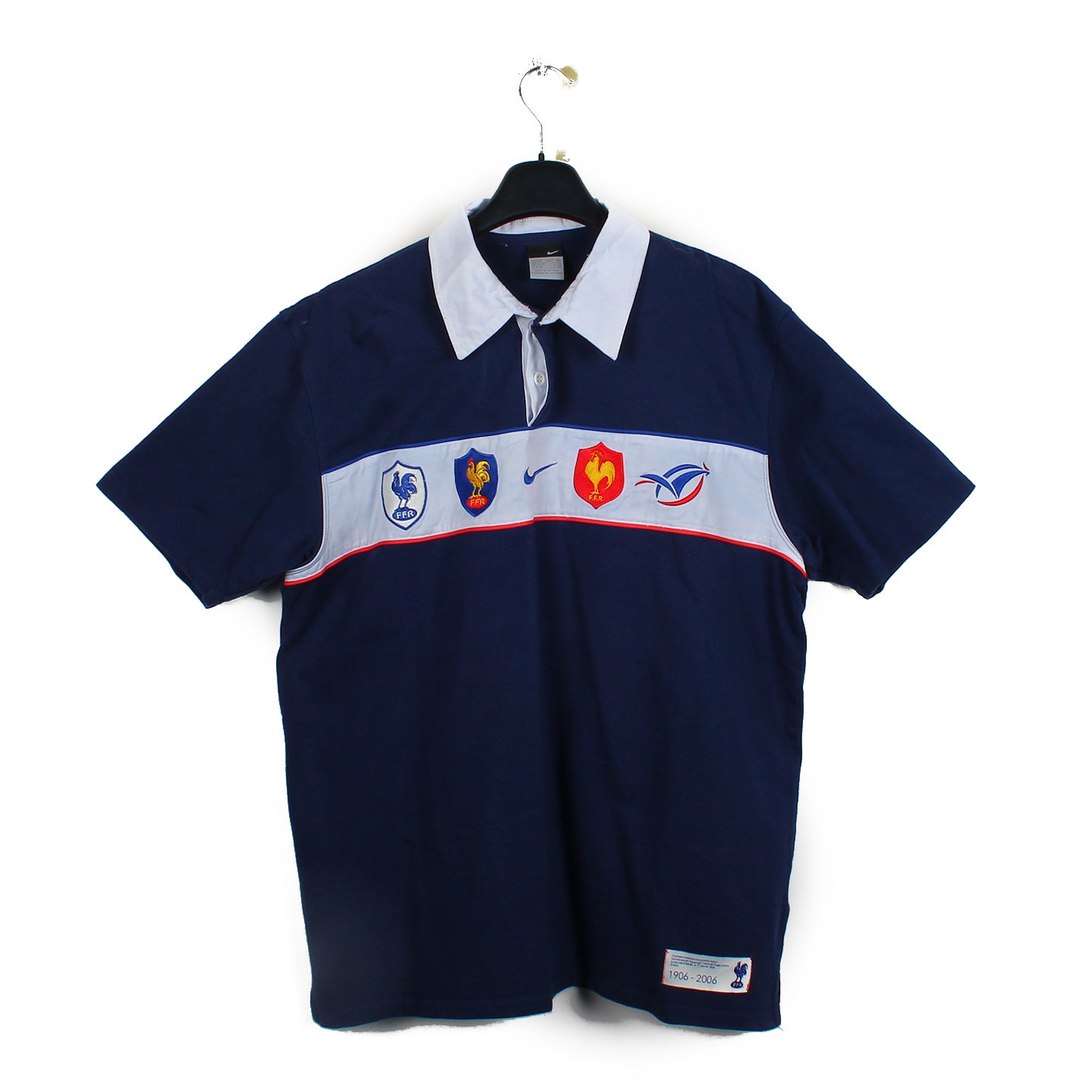 Histoire : Maillot porté par l'équipe de France de rugby lors du tournoi des 6 nations 2007. Ce dernier sera remporté par les Bleus devant l'Irlande grâce à une victoire à Dublin lors du dernier match.