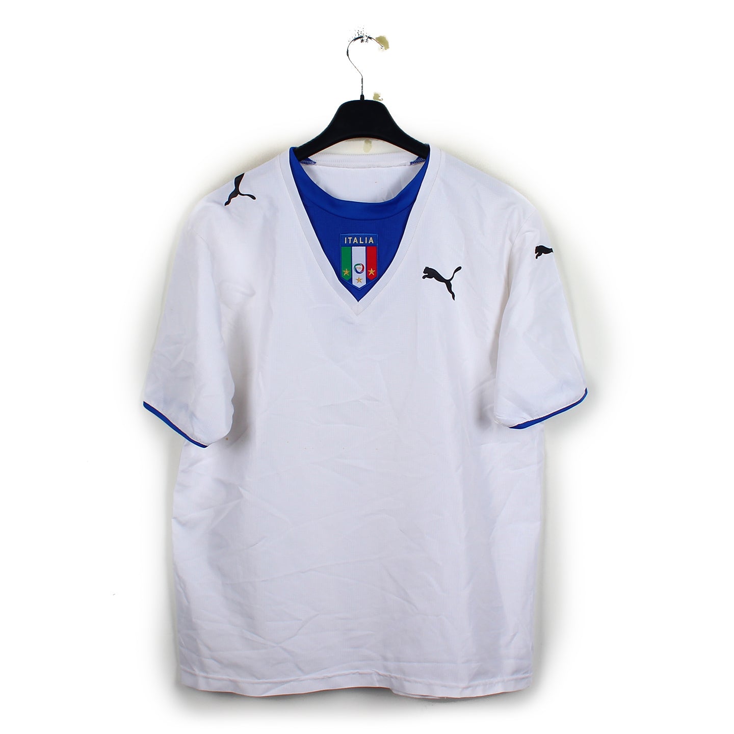 Histoire : Maillot extérieur porté par les Italiens lors de la Coupe du Monde 2006 qui les verra sacrée Champion du Monde après leur victoire aux tirs au but face à l'Equipe de France.