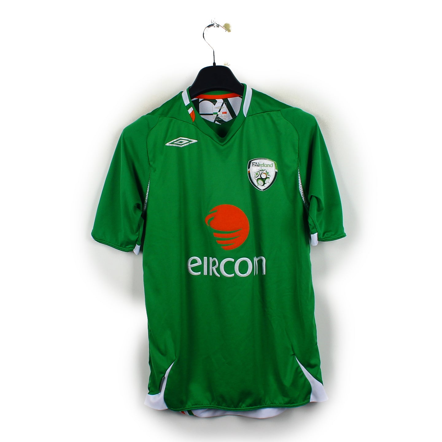 Histoire : Maillot domicile porté par les irlandais lors de la campagne de qualification pour l'Euro 2008 organisé en Suisse et Autriche. Héritant d'un tirage difficile les Irlandais termineront 3ème dans un groupe dominé par l'Allemagne et ne se qualifieront pas.