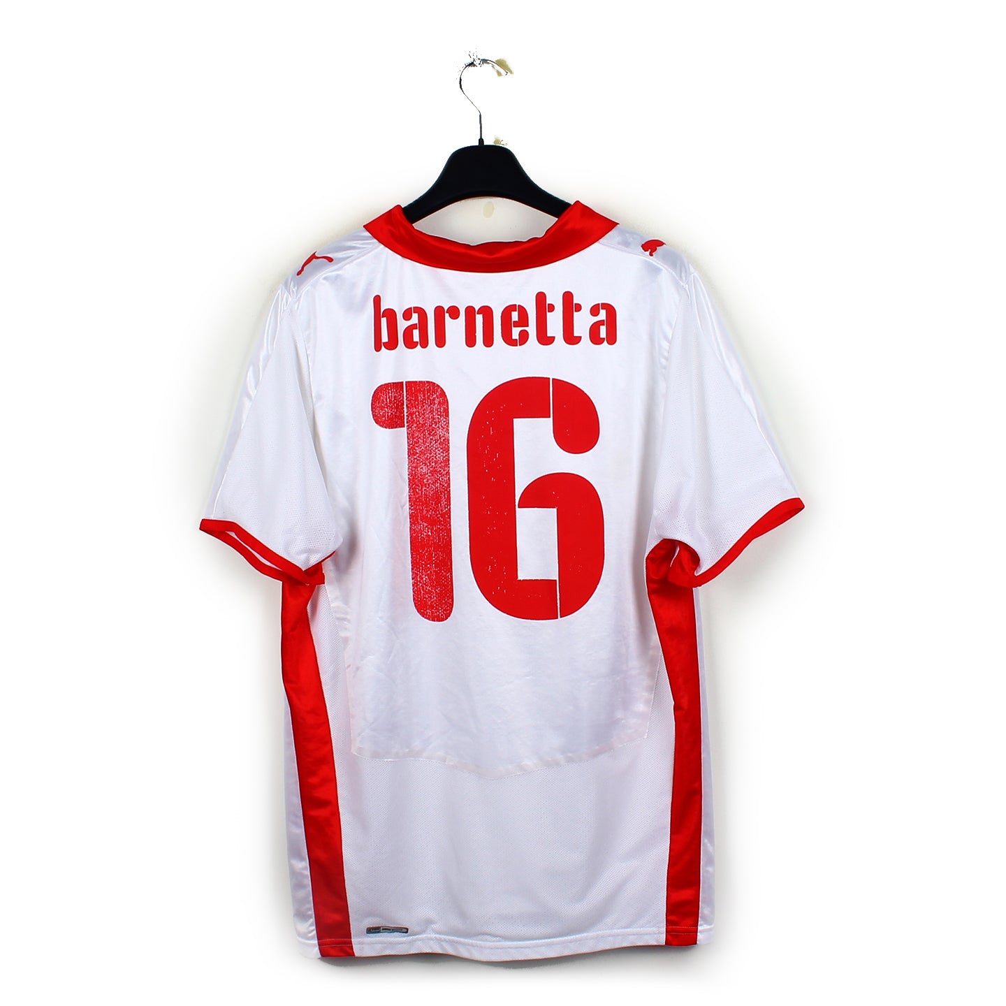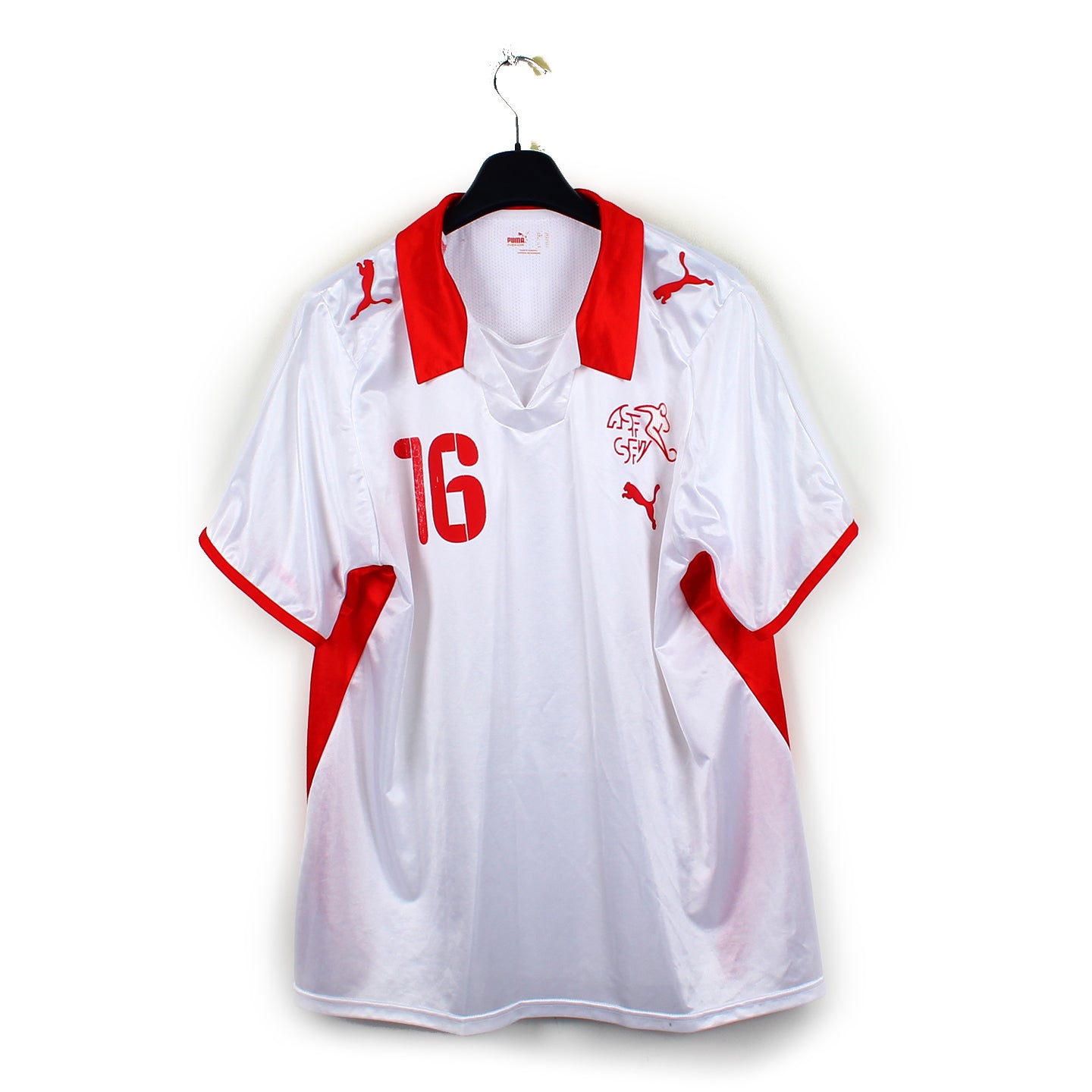 Histoire : Maillot extérieur porté par les Suisses lors de l'Euro 2008. Les coéquipiers d'Alexander Frei ne parviendront pas à sortir d'un groupe compliqué avec le Portugal, la Turquie et la Tchéquie, malgré la victoire contre les coéquipiers de Quaresma.