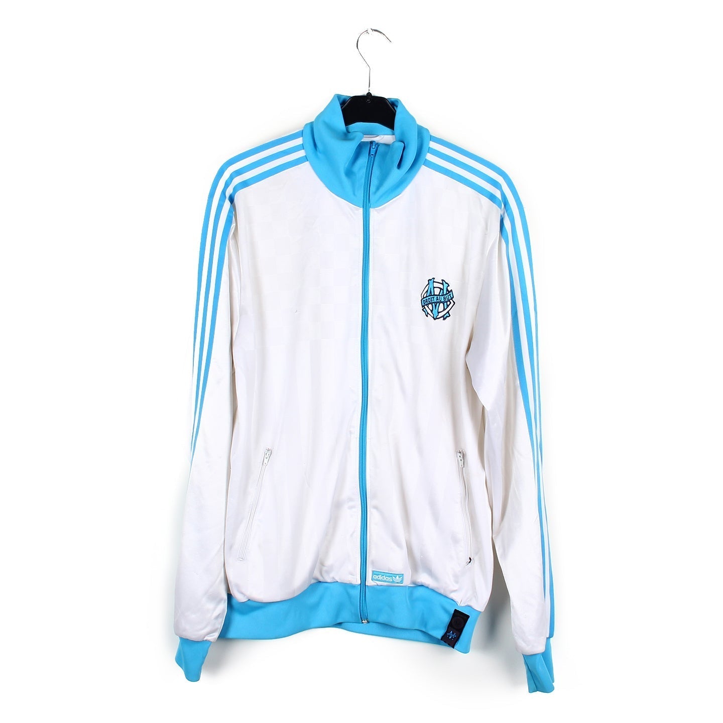 Histoire : Veste de survêtement portée lorsque les hommes de Didier Deschamps seront sacrés champions de France, premier titre majeur depuis la victoire des olympiens en Champions League (1992/93). Bien aidé par un Mamadou Niang à 18 buts (meilleur buteur du championnat) et un Lucho Gonzalez à 11 passes décisives (meilleur passeur du championnat), L'OM obtiendra aussi le doublé en gagnant la Coupe de la Ligue face aux Girondins.