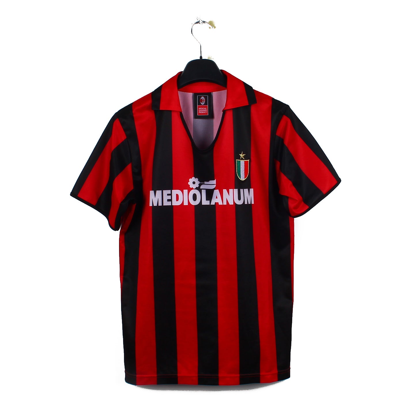 Histoire : Maillot domicile porté par les hommes d’Arrigo Sacchi lors d’une saison où ils termineront seconds de la Serie A. Les Milanais gagneront cette année la Supercoupe d’Europe et la Coupe Intercontinentale.