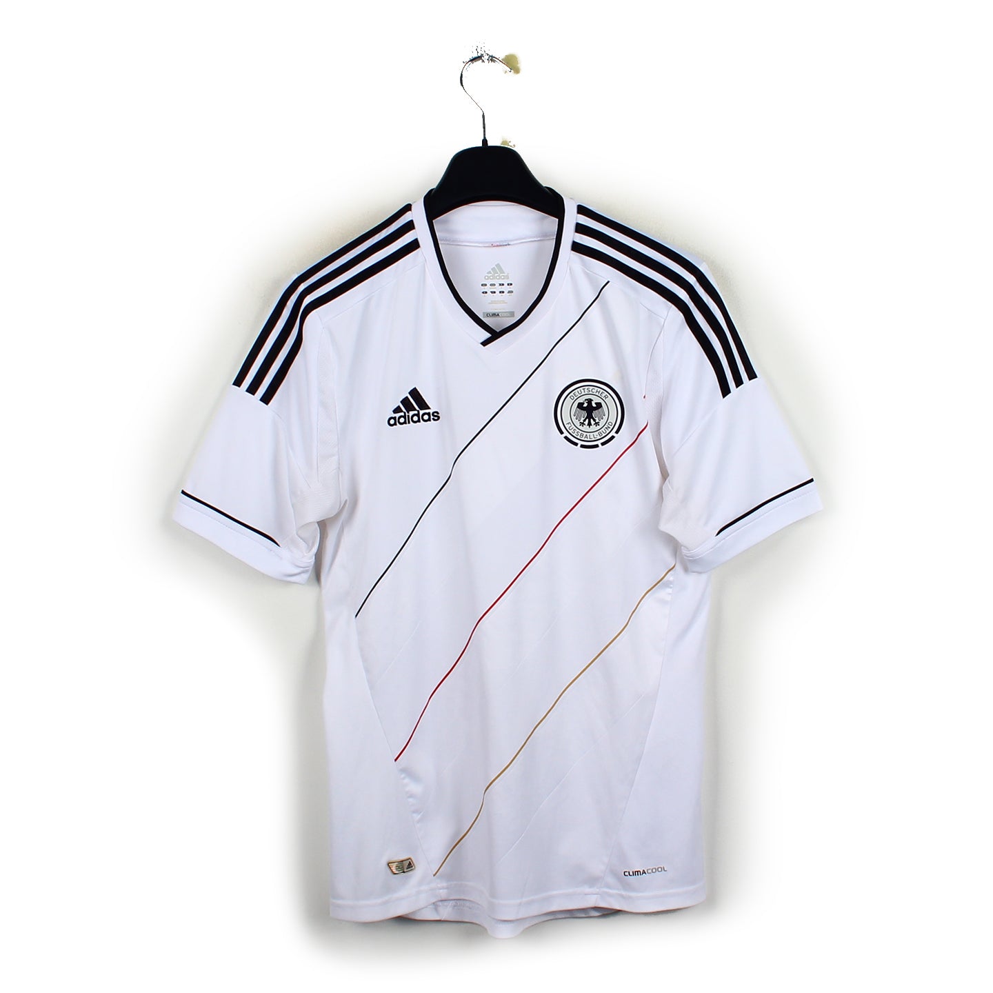 Histoire : Maillot domicile porté par les Allemands lors de l'Euro 2012 organisé en Pologne et en Ukraine. Après une phase de poule maitrisée, la Mannschaft sera éliminée en demi-finale par un doublé de Balotelli (1-2)