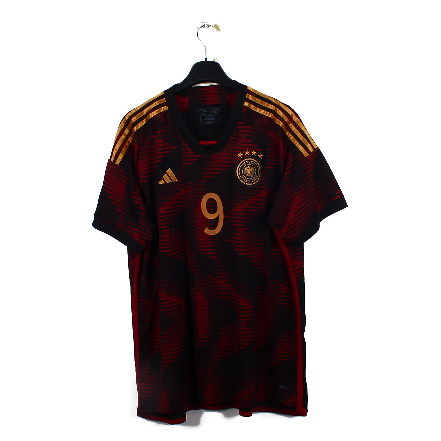 Histoire : Maillot extérieur porté par les Allemands lors de la Coupe du Monde 2022 où ils finiront 3ème de leur groupe derrière le Japon et l'Espagne, synonyme d'élimination.