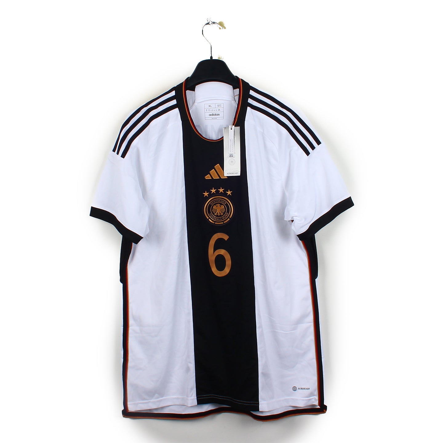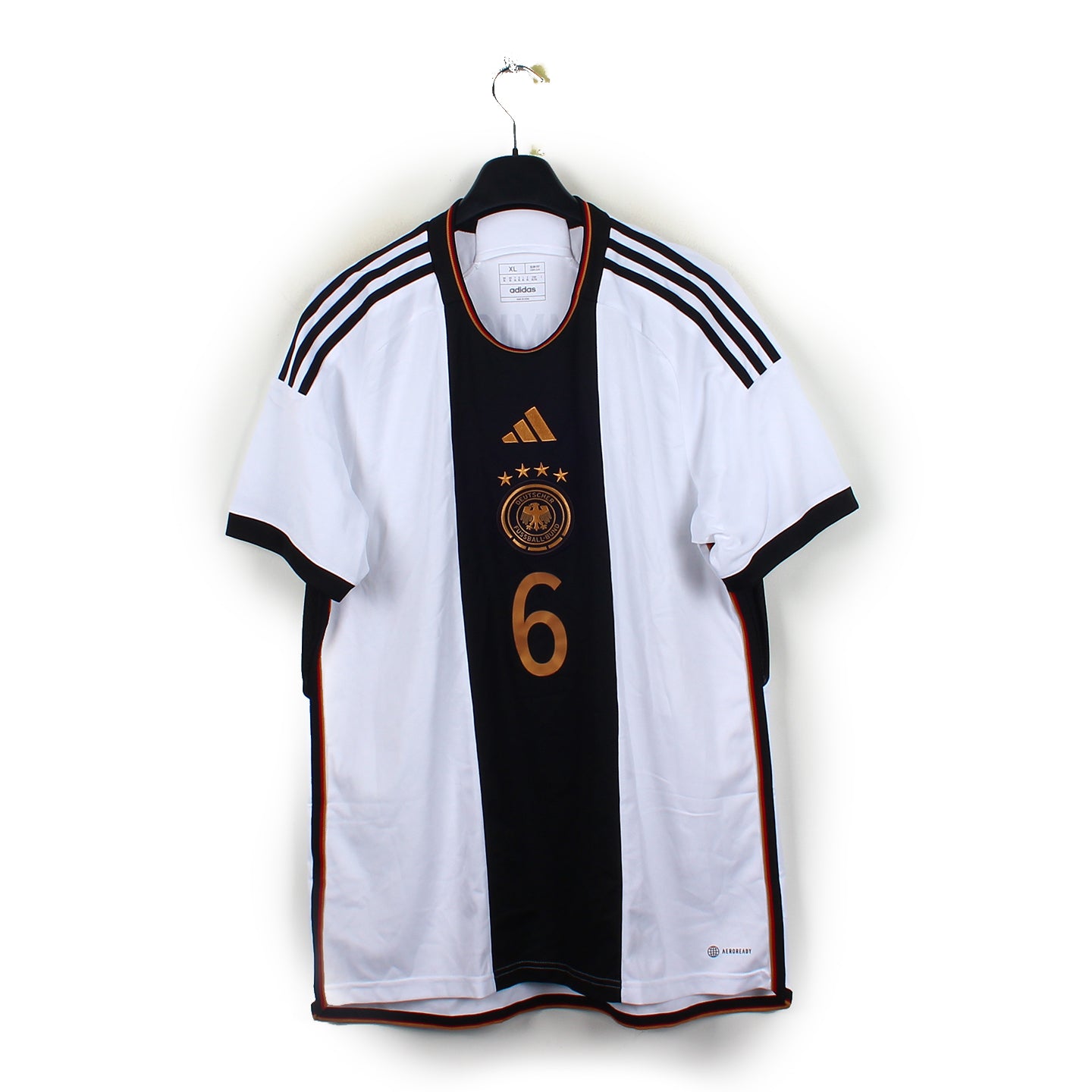 Histoire : Maillot domicile porté par les Allemands lors de la Coupe du Monde 2022 où ils finiront 3ème de leur groupe derrière le Japon et l'Espagne, synonyme d'élimination.