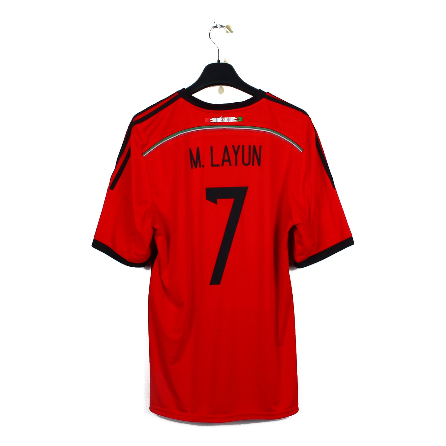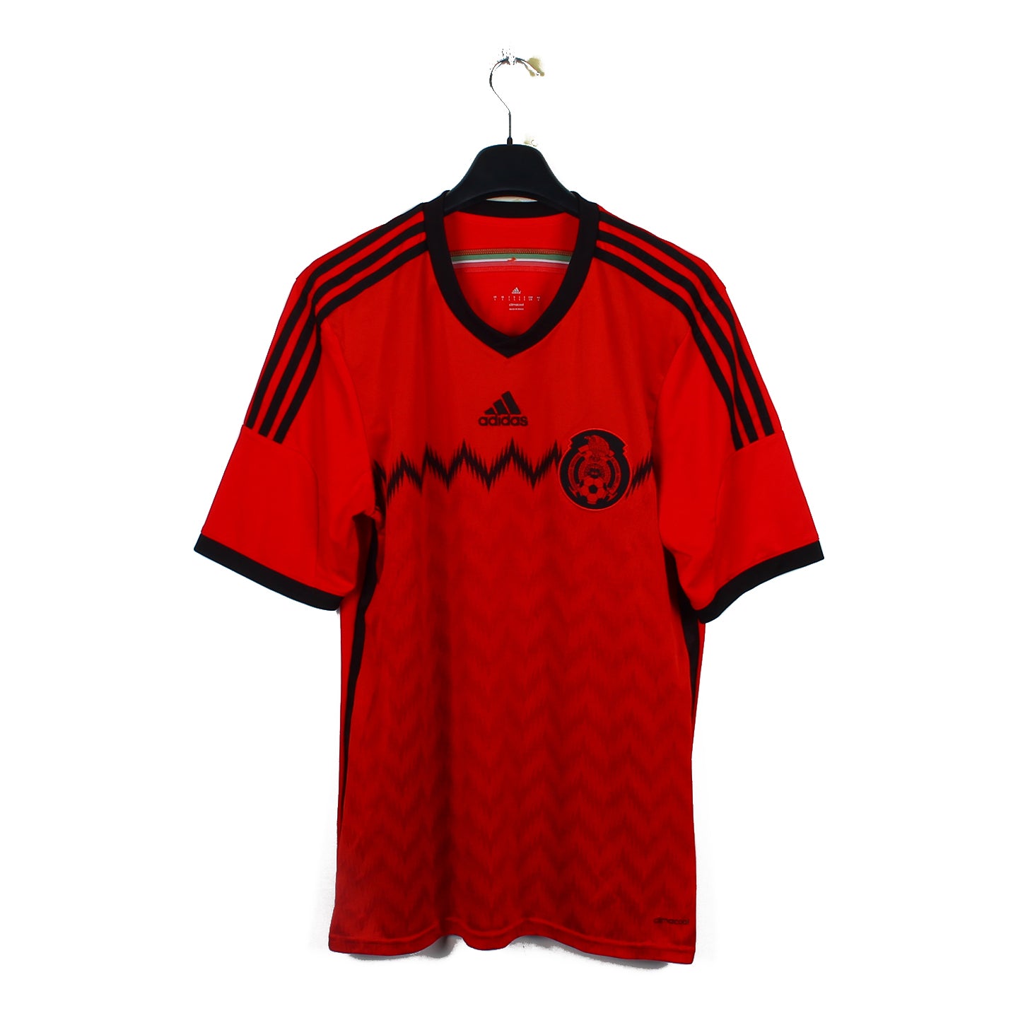 Histoire : Maillot extérieur porté par les hommes de Miguel Herrera à la Coupe du Monde 2014. Les Mexicains se hisseront jusqu'en huitièmes où les Pays-Bas prendront le dessus dans le temps additionnel (1-2).
