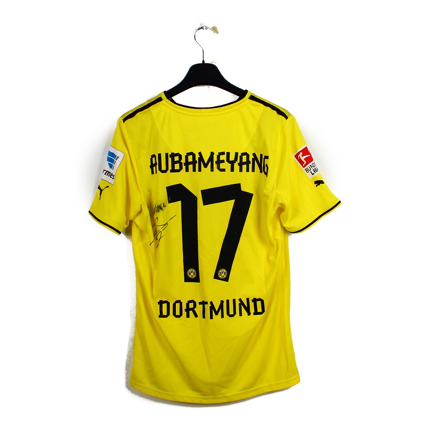 Le maillot en détail : Maillot porté/préparé par Pierre-Emerick Aubameyang en excellent état. Les logos brodés et les flocages sont nickels. Signature du joueur au dos avec mention de l'ancien propriétaire.