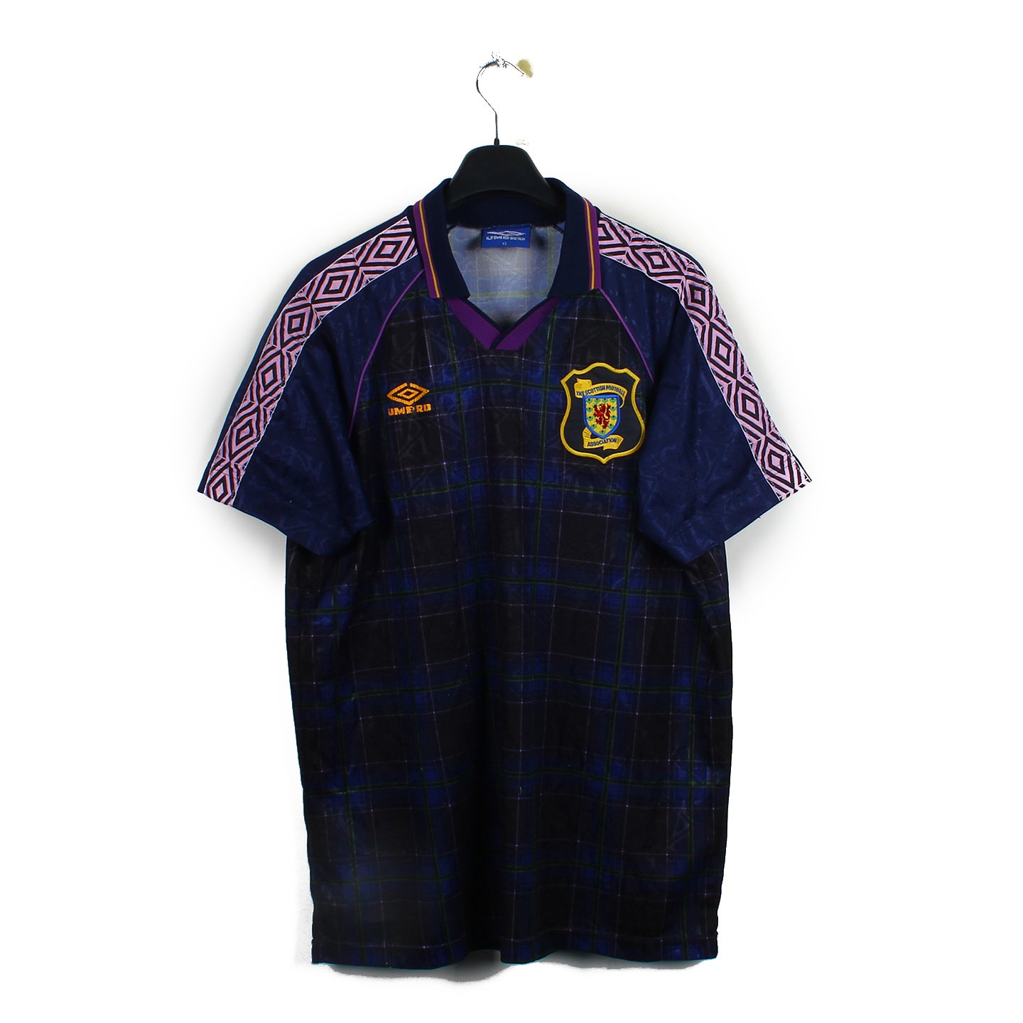 Histoire : Maillot domicile porté lors de l'Euro 96 chez les voisins Anglais. Dans un groupe compliqué avec l'Angleterre, les Pays-Bas et la Suisse, l'Ecosse tiendra son rang et sera proche de passer, avec 4 points (autant que les Hollandais, mais éliminée à la différence de buts).
