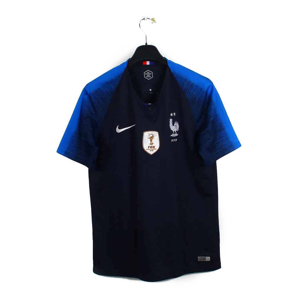 Histoire : Maillot domicile arboré lors de la Coupe du Monde 2018 organisée en Russie, édition durant laquelle les bleus seront sacrés pour la seconde fois de leur histoire après 98.