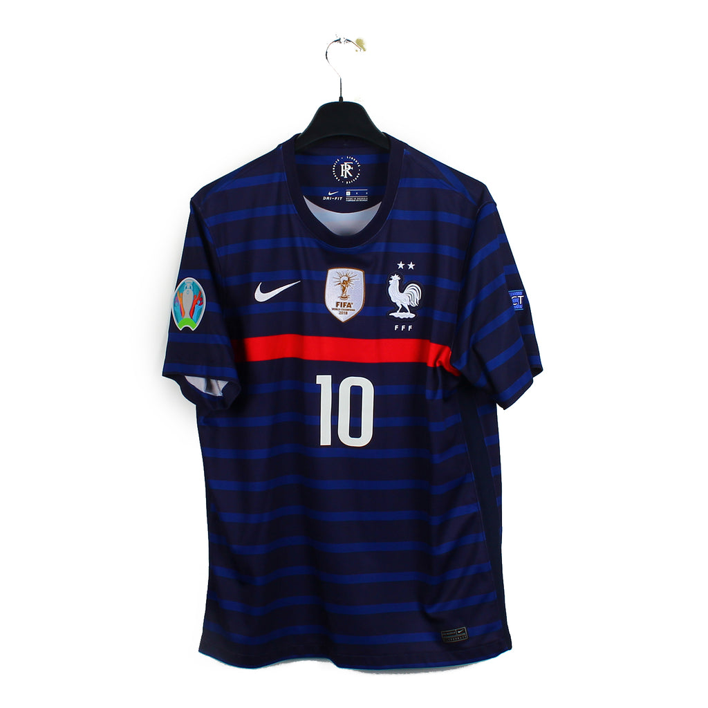 Histoire : Maillot domicile porté lors de l'Euro 2020 disputé en 2021. Les Bleus seront éliminés dès les 8èmes de finale face à la Suisse.
