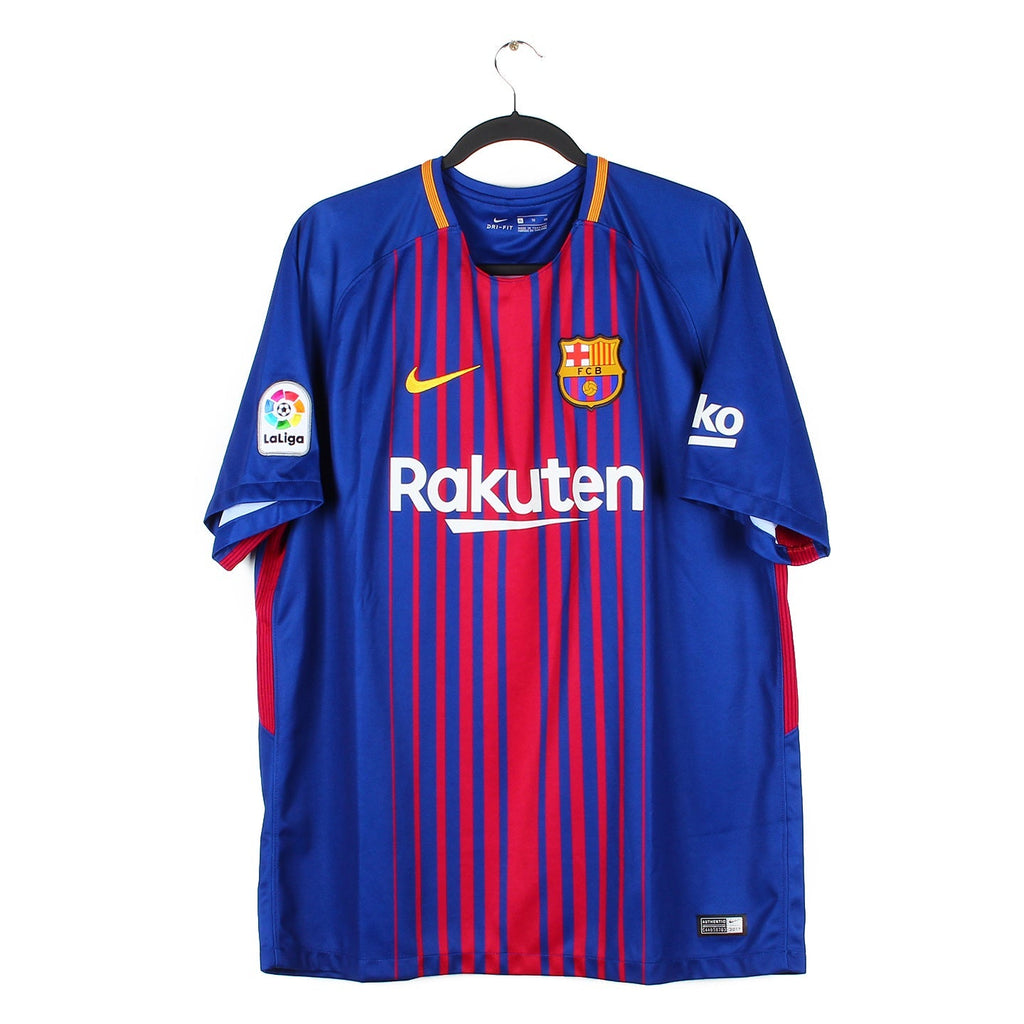 Histoire : Maillot domicile porté sous les ordres d'Ernesto Valverde lorsque le Barca sera une nouvelle fois sacré champion d'Espagne. Le parcours en Europe se terminera plus tôt que prévu puisque les coéquipiers de Léo Messi seront éliminés par la Roma, malgré un match aller remporté 4-1 (défait 0-3 au retour). L'argentin fera une nouvelle saison exceptionnelle à 45 buts.