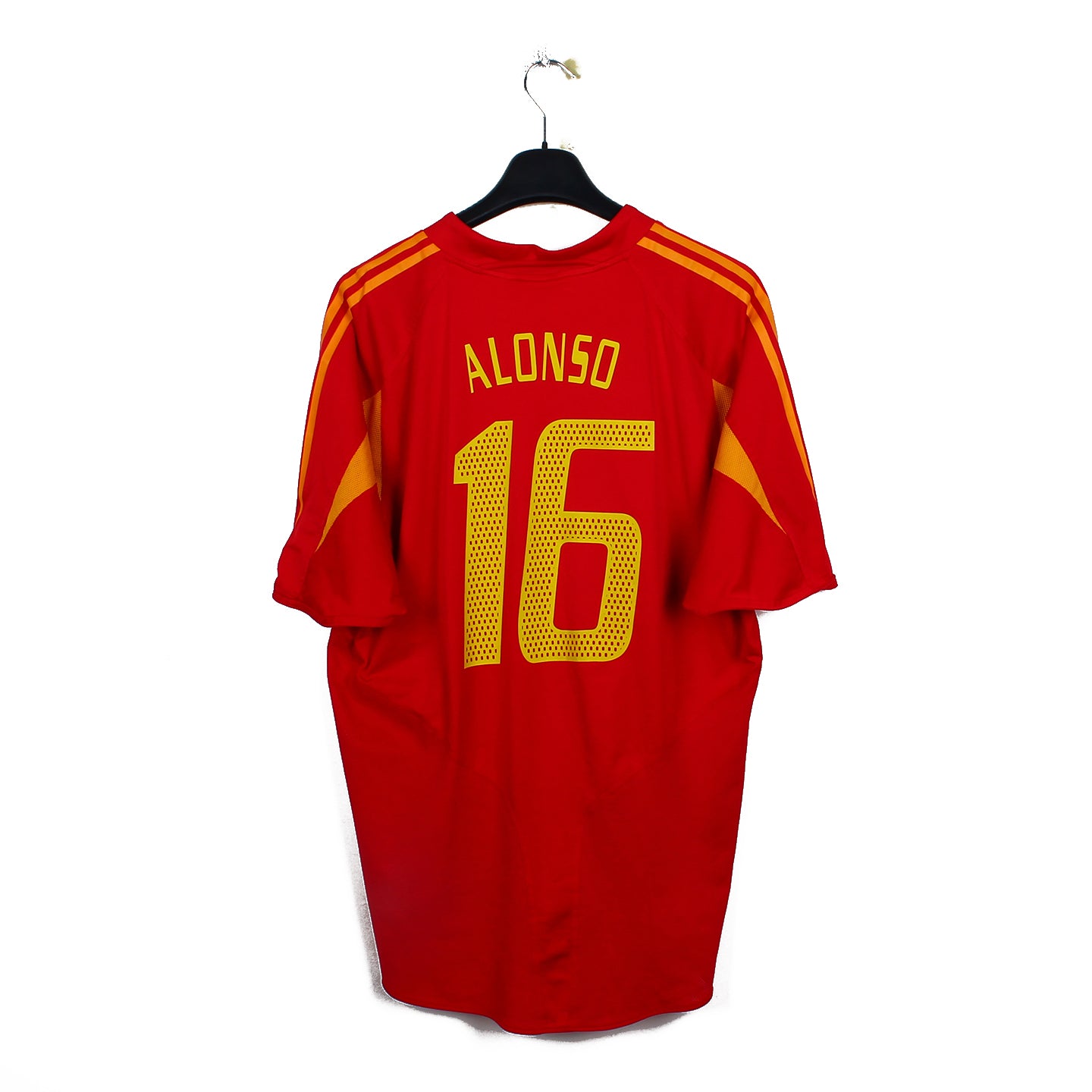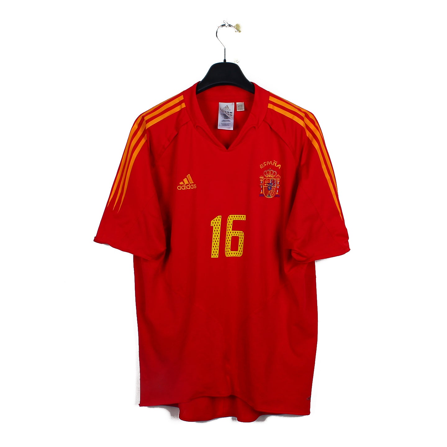 Histoire : Maillot porté par la Roja lors de l'Euro 2004 organisé au Portugal. Les coéquipiers de Raul seront éliminés dès la phase de groupes, terminant 3ème derrière les Portugais et les futurs champions Grecs.