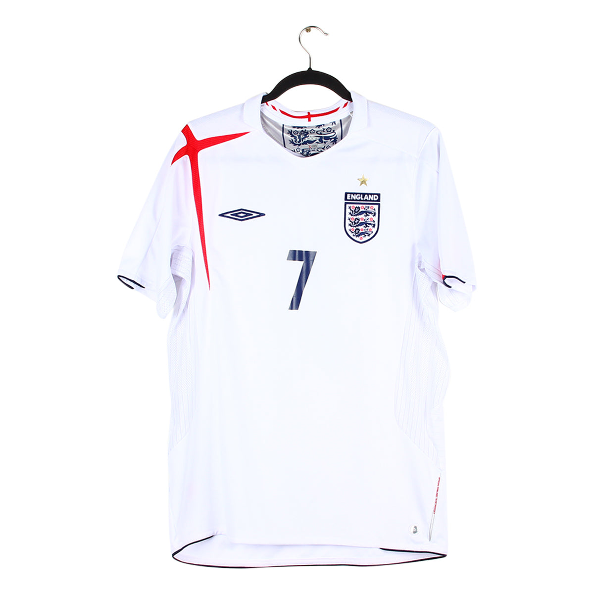 Histoire : Maillot domicile porté par la sélection des trois lions lors de la Coupe du Monde 2006 organisée en Allemagne. Les coéquipiers de Steven Gerrard parviendront à se hisser en quart de finale avant de se voir éliminer aux tirs au but par le Portugal.