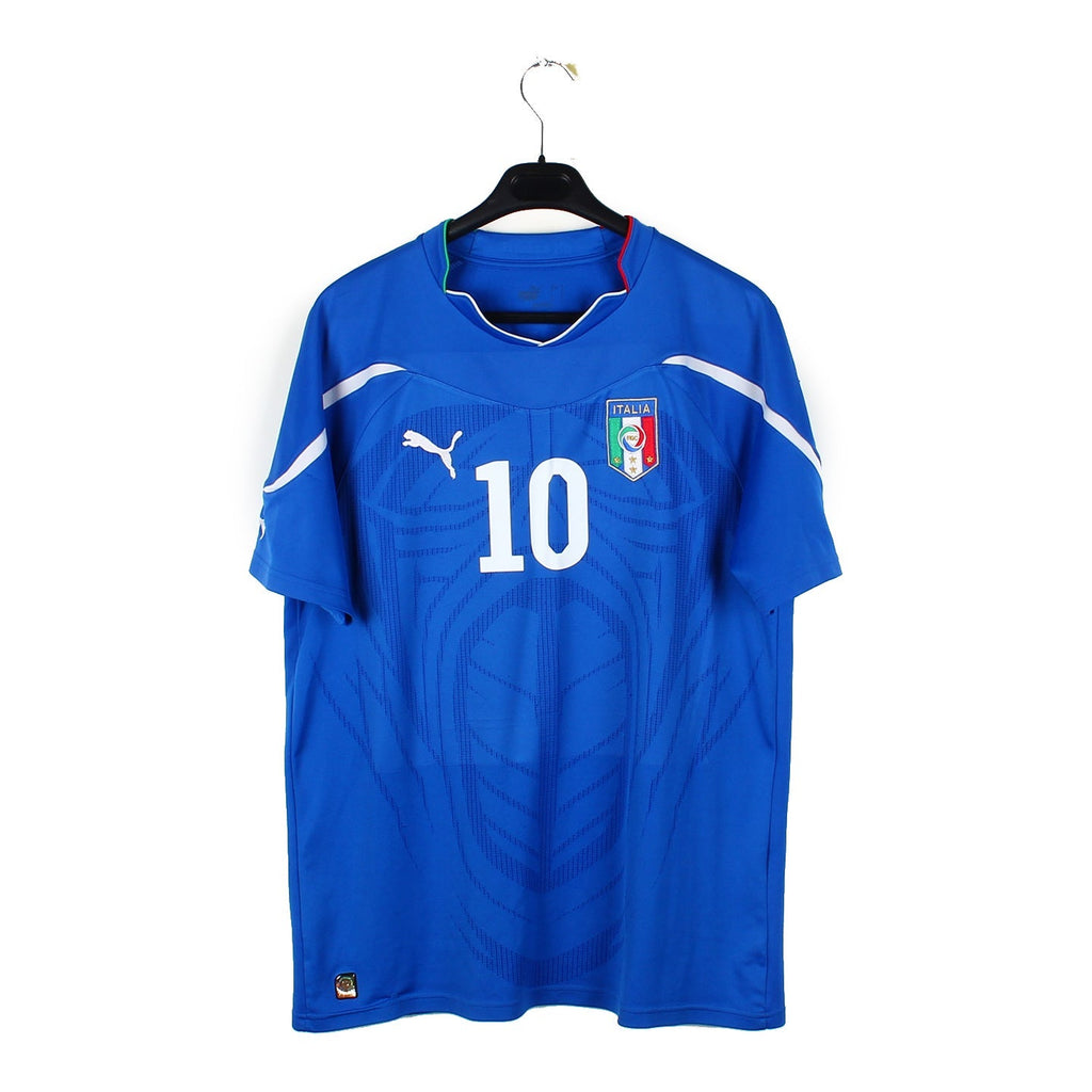 Histoire : Maillot domicile de l'équipe italienne championne du monde durant la Coupe du monde 2010. Edition où la Squadra Azzura sera étonnamment éliminée dès les phases de groupes, forgeant le mythe des anciens champions du monde expulsés dès les poules.