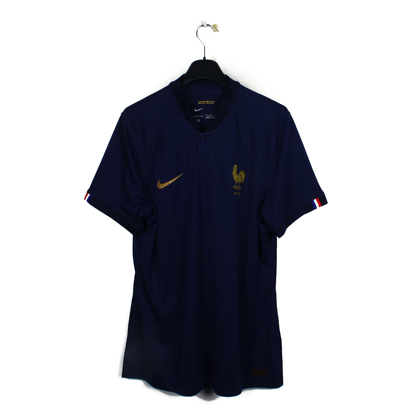 Histoire : Maillot domicile porté lors de la Coupe du Monde 2022 où les Bleus seront vaincus par l'Argentine de Leo Messi aux tirs au but après une rencontre historique.
