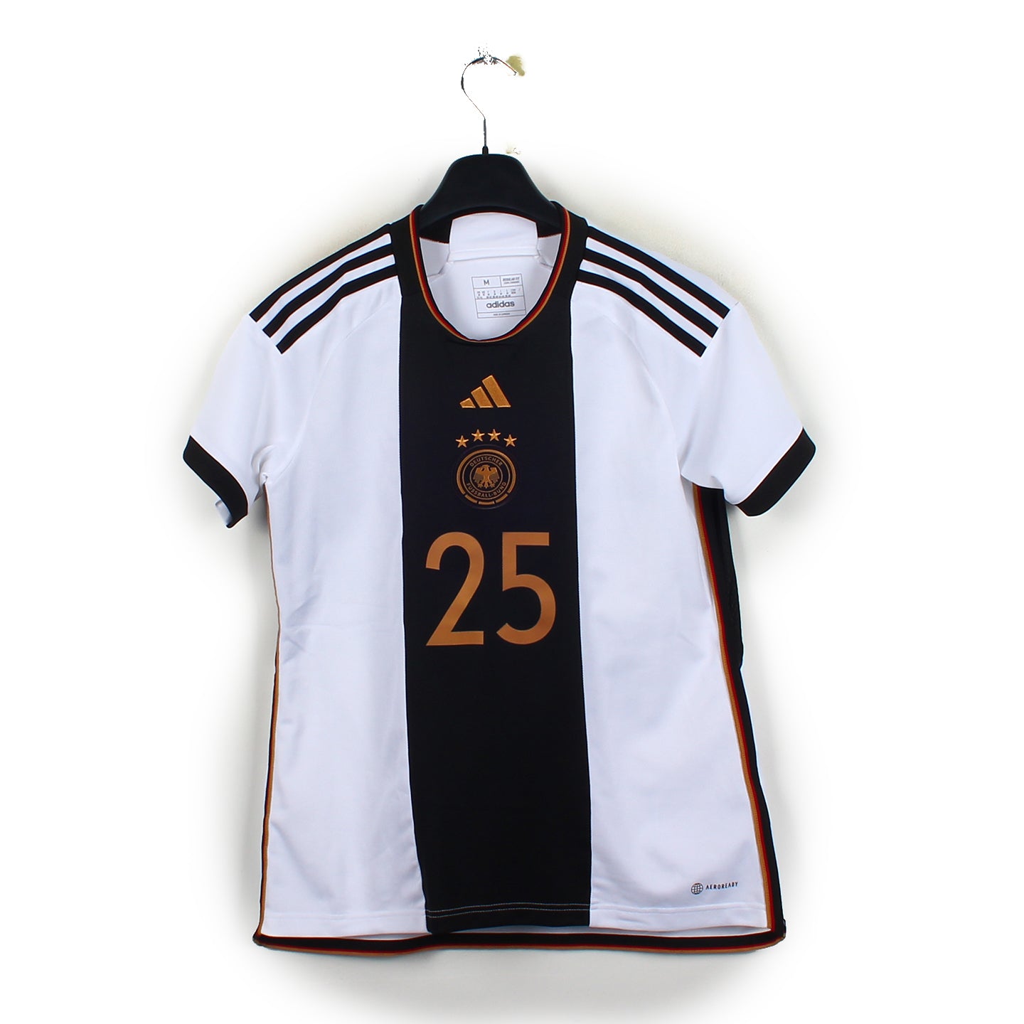 Histoire : Maillot domicile porté par les Allemands lors de la Coupe du Monde 2022 où ils finiront 3ème de leur groupe derrière le Japon et l'Espagne, synonyme d'élimination.