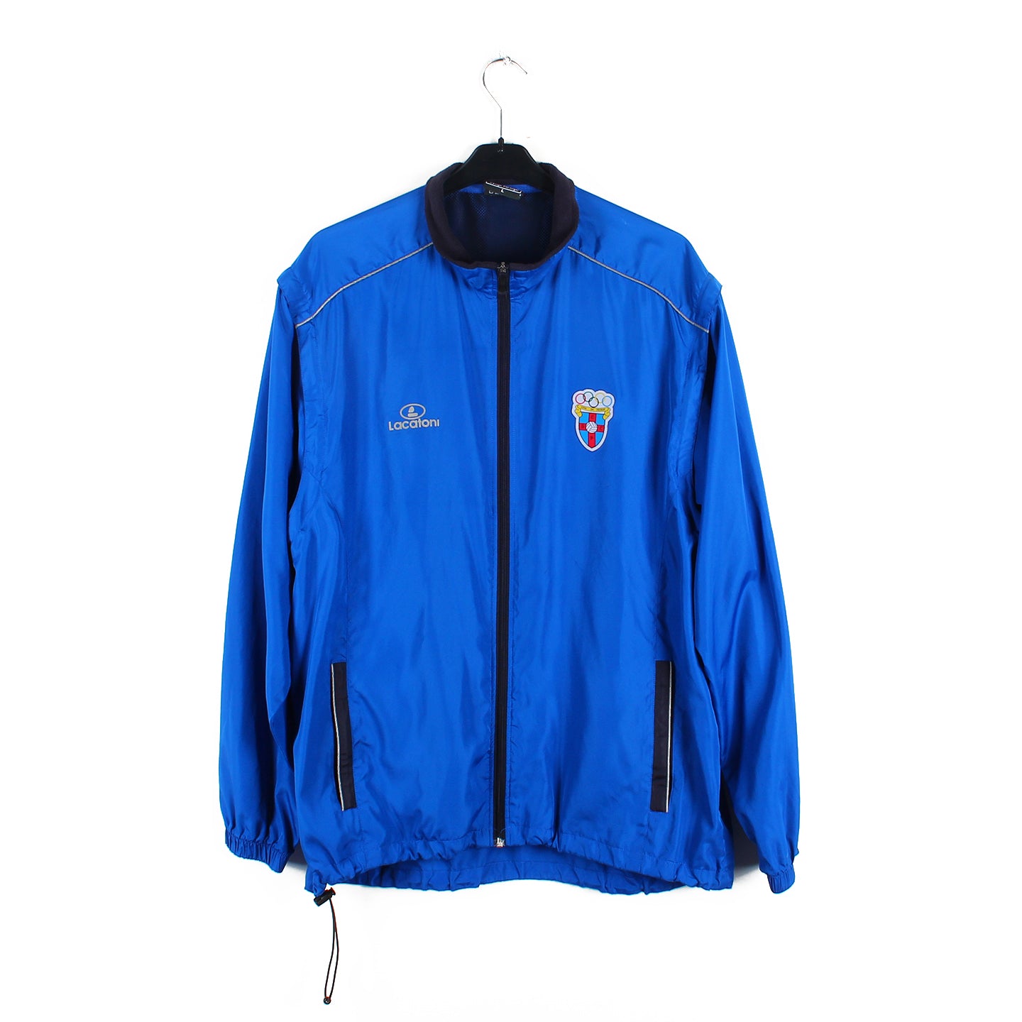 La pièce en détail : Veste de sortie portée par le club portugais sous Lacatoni. Proche de Lisbonne, le club découvrira le monde pro en 2016 avec une ascension en seconde division. Petite usure du logo Lacatoni.