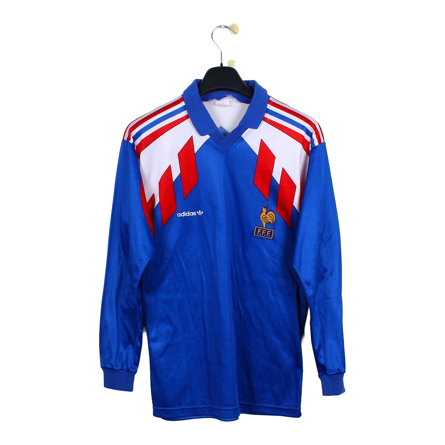 Histoire : Maillot domicile porté sous la houlette de Michel Platini, lors des qualifications de l'Euro 1992 en Suède. Les français finiront 1er de leur groupe devant la Tchècoslovaquie et l'Espagne.