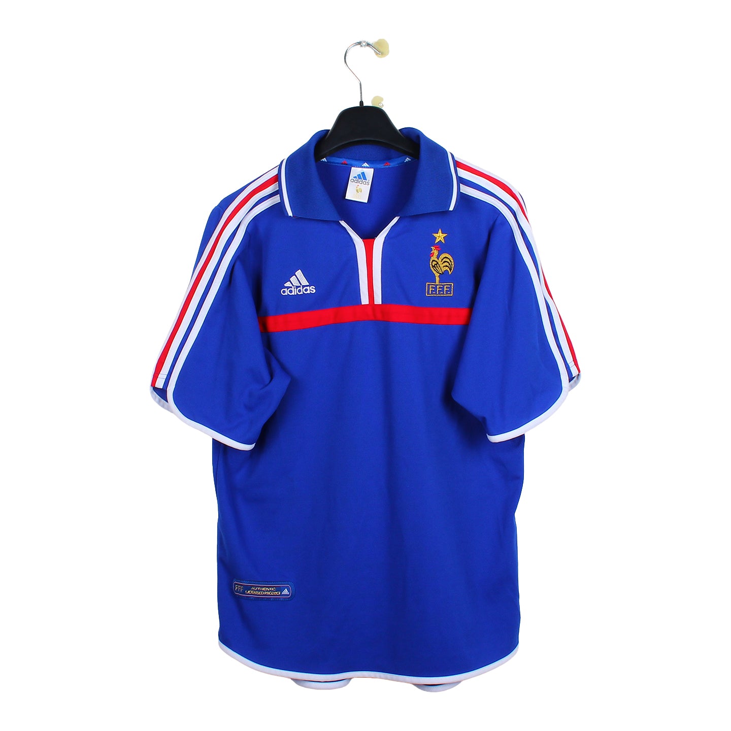 Histoire : Maillot domicile porté par les tricolores lors de l'Euro 2000. Les français continueront de marcher sur le monde du football en gagnant leur deuxième compétition consécutive avec une finale d'anthologie face à l'Italie.