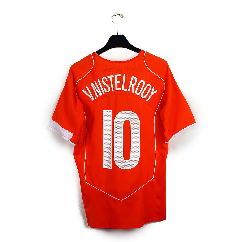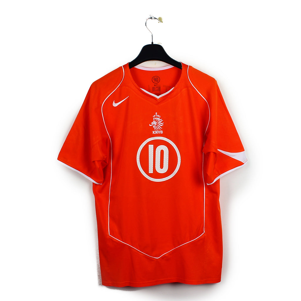 Histoire : Maillot domicile porté par la Hollande lors de l'Euro 2004. Les hommes de Dick Advocaat iront jusqu'en demi-finale où ils s'inclineront face à l'hôte portugais du jeune Cristiano Ronaldo.