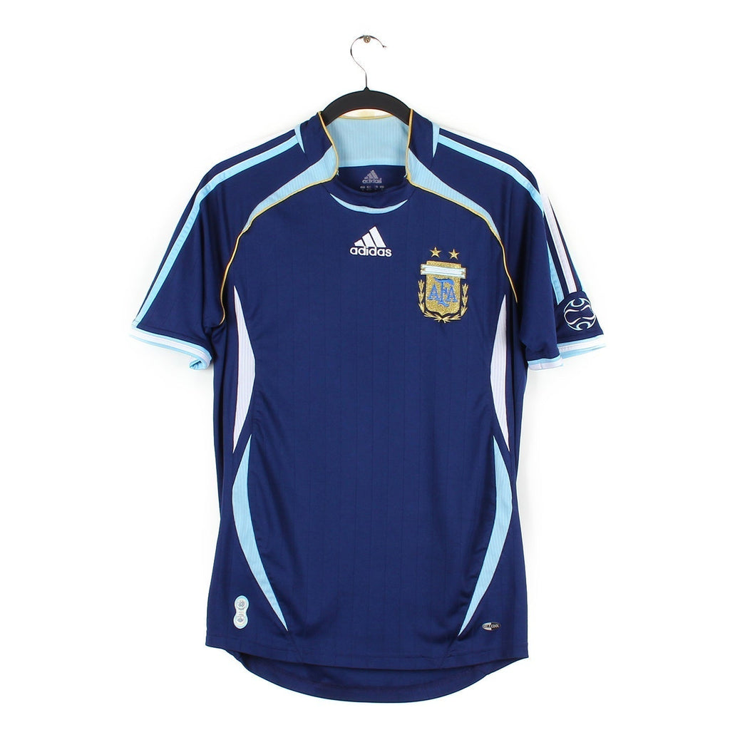 Histoire : Maillot extérieur porté par les Argentins de Marcelo Bielsa à la Coupe du Monde 2006. Après une phase de poules maitrisés, les coéquipiers à Hernan Crespo sortiront le Mexique en huitièmes, avant de perdre tristement aux TAB en quart face à l'organisateur allemand.