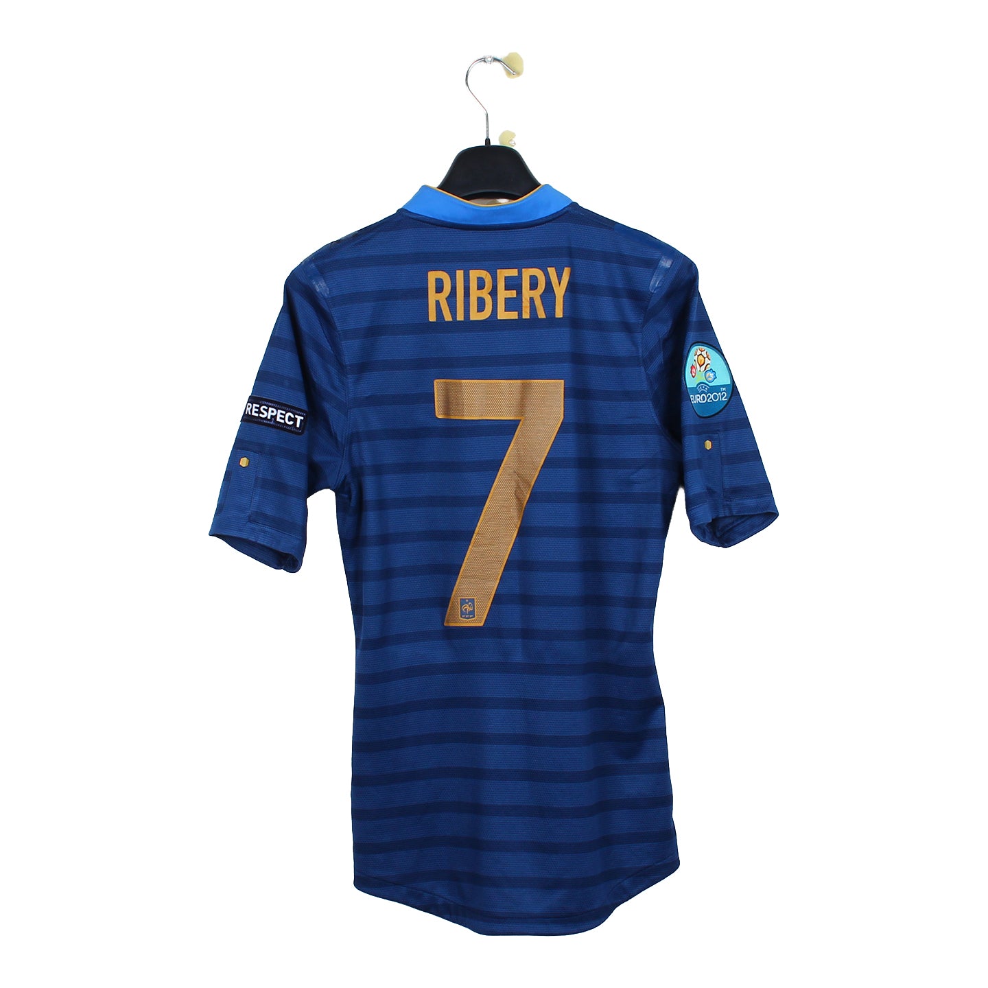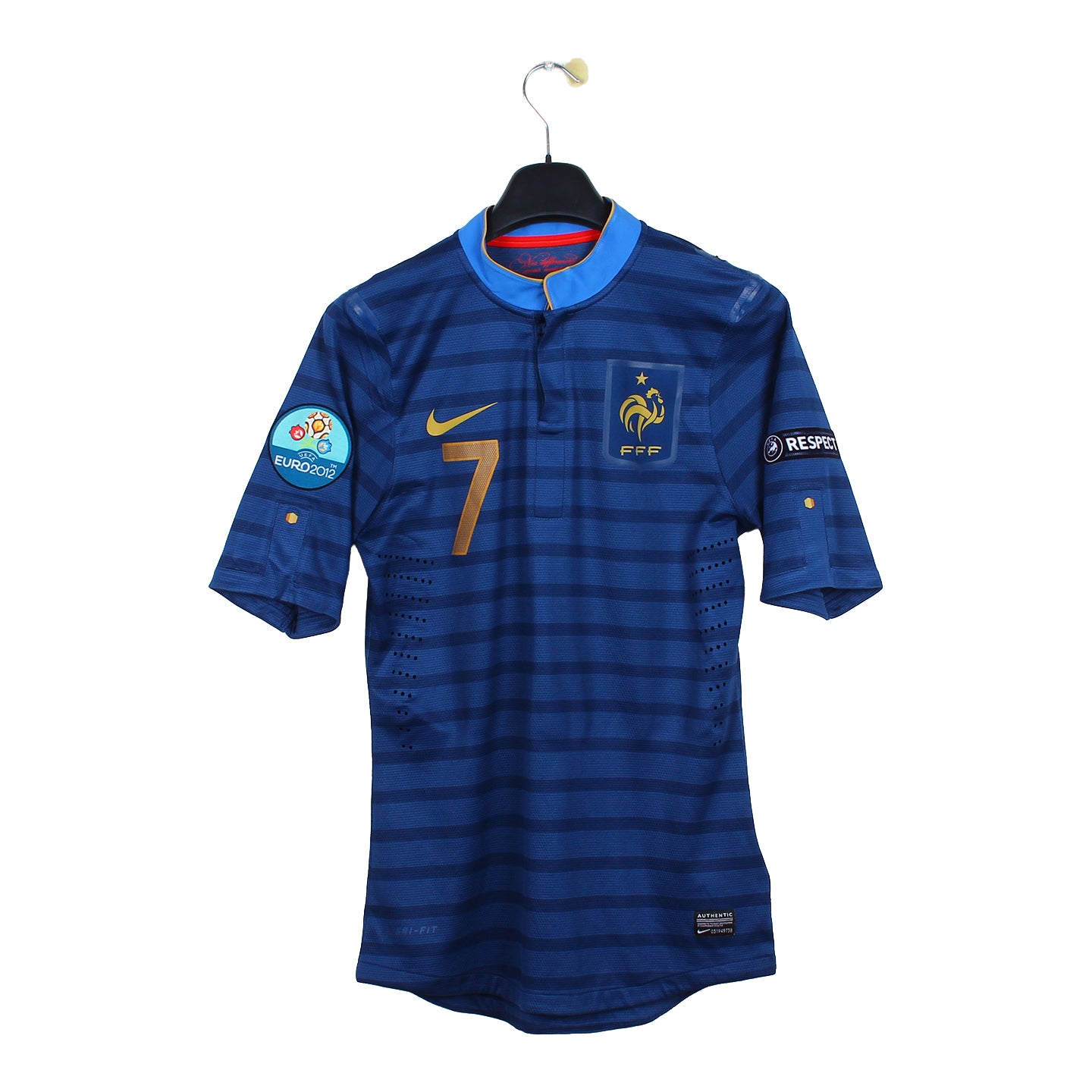 Histoire : Maillot domicile utilisé lors de l'année 2012, sous l'ère Laurent Blanc. Après le scandale de 2010, les Bleus se veulent revanchards mais verront leurs rêves s'effondrer face aux champions en titre espagnols (2-0).