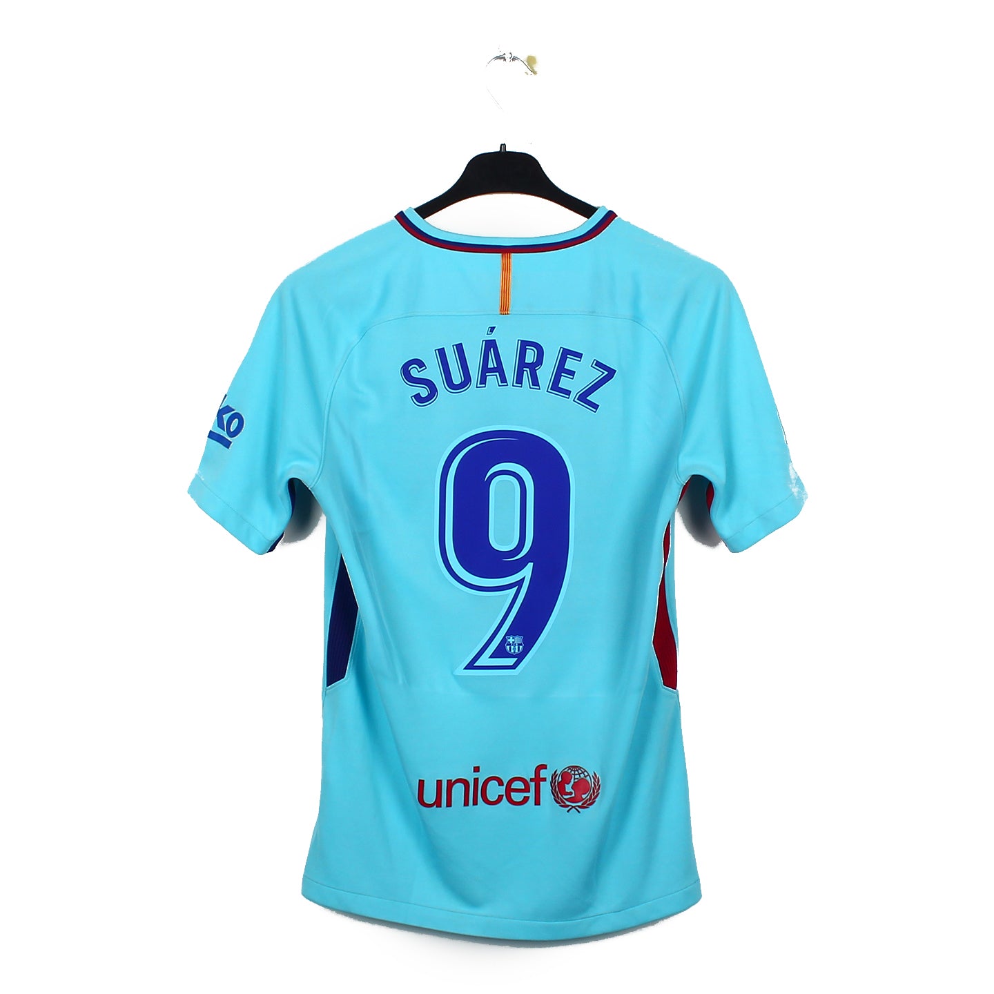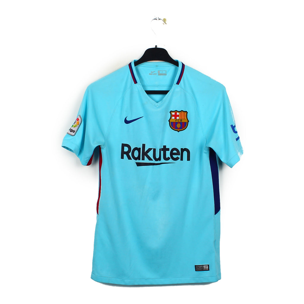 Histoire : Maillot extérieur porté sous les ordres d'Ernesto Valverde lorsque le Barca sera une nouvelle fois sacré champion d'Espagne. Le parcours en Europe se terminera plus tôt que prévu puisque les coéquipiers de Léo Messi seront éliminés par la Roma, malgré un match aller remporté 4-1 (défait 0-3 au retour). L'argentin fera une nouvelle saison exceptionnelle à 45 buts.