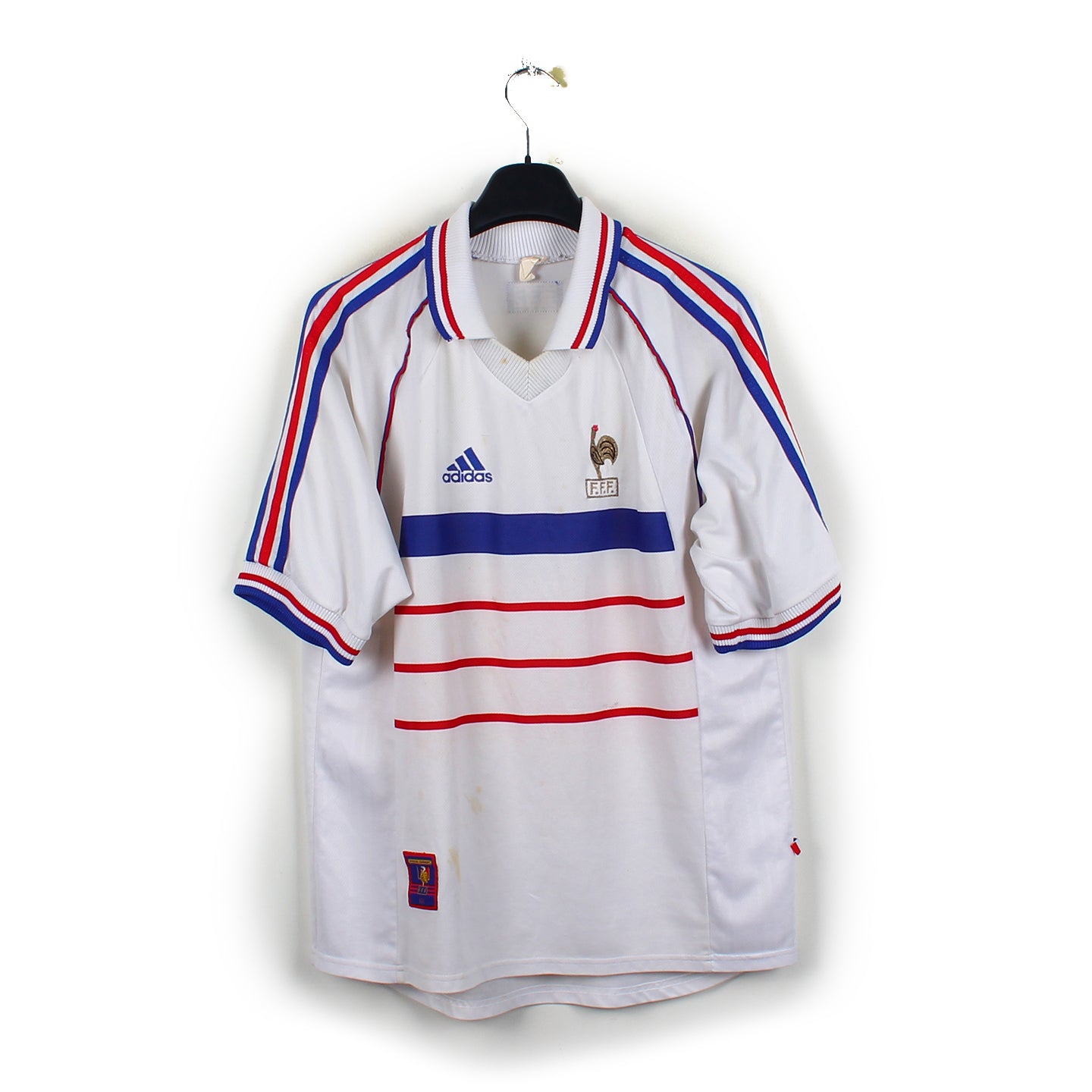 Histoire : Premier maillot extérieur comportant l'étoile sur l'écusson avec la légendaire victoire des Bleus de Zizou face aux Brésiliens de Ronaldo (3-0).