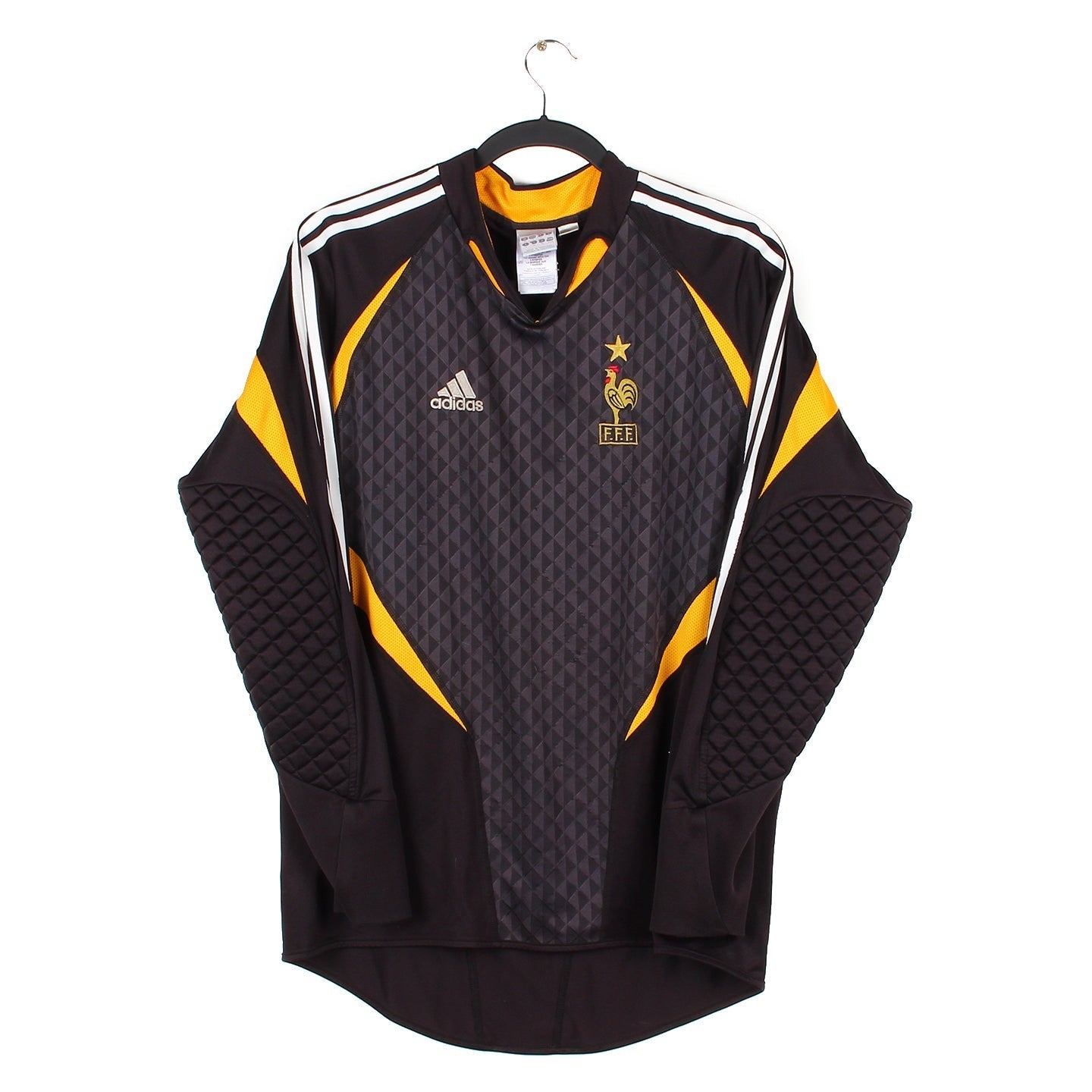 Histoire : Maillot gardien porté pendant l'Euro 2004, lorsque Zidane offrait sur penalty dans le temps additionnelle la victoire à son équipe lors du premier match de la compétition. Les Bleus seront éliminés 1-0 par les grecs, futurs vainqueurs.