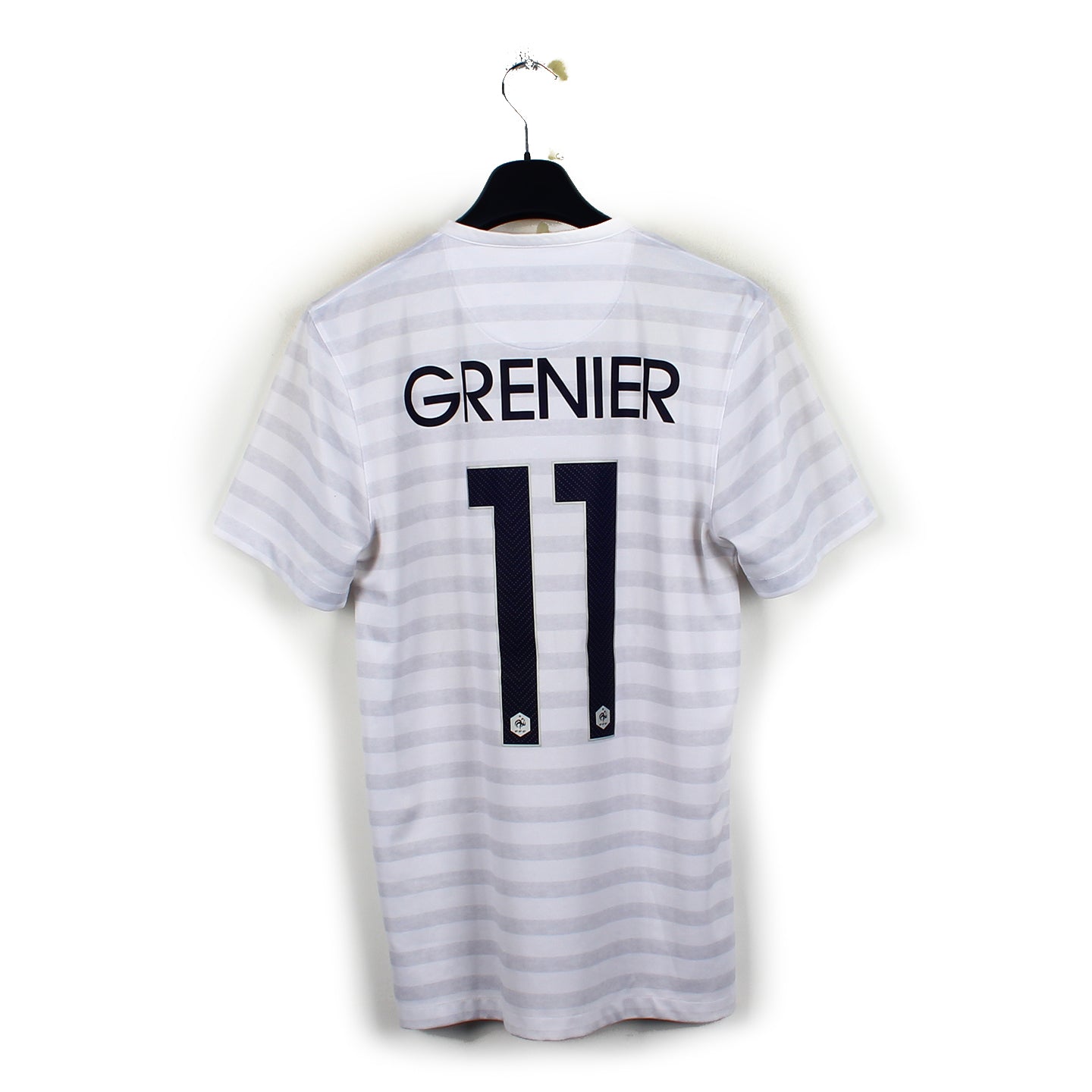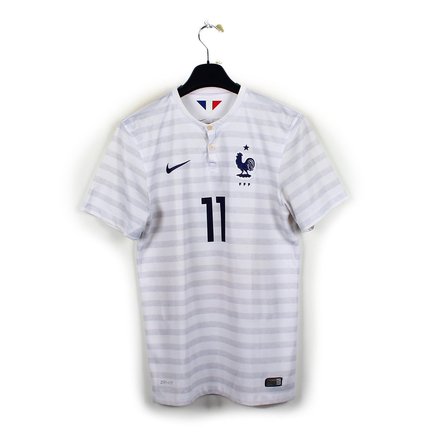 Histoire : Maillot extérieur porté par les français lors de la Coupe du Monde 2014. Sous les ordres de Didier Deschamps, les français feront des prestations plus que convaincantes avant de tomber sur le futur champion du monde allemand en s'inclinant 1-0 en quarts de finale.