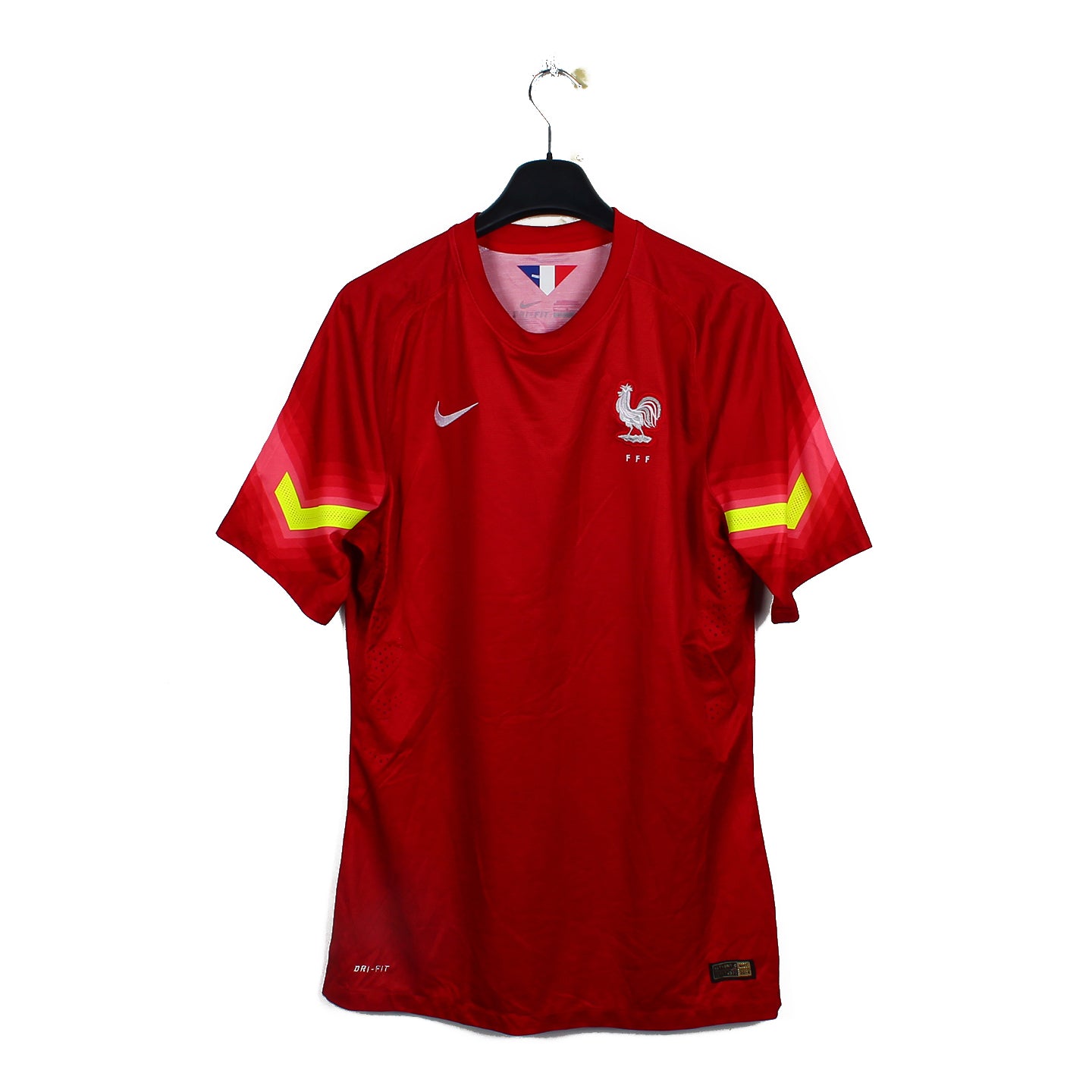 Histoire : Maillot extérieur porté par les français lors de la Coupe du Monde 2014. Sous les ordres de Didier Deschamps, les français feront des prestations plus que convaincantes avant de tomber sur le futur champion du monde allemand en s'inclinant 1-0 en quarts de finale.