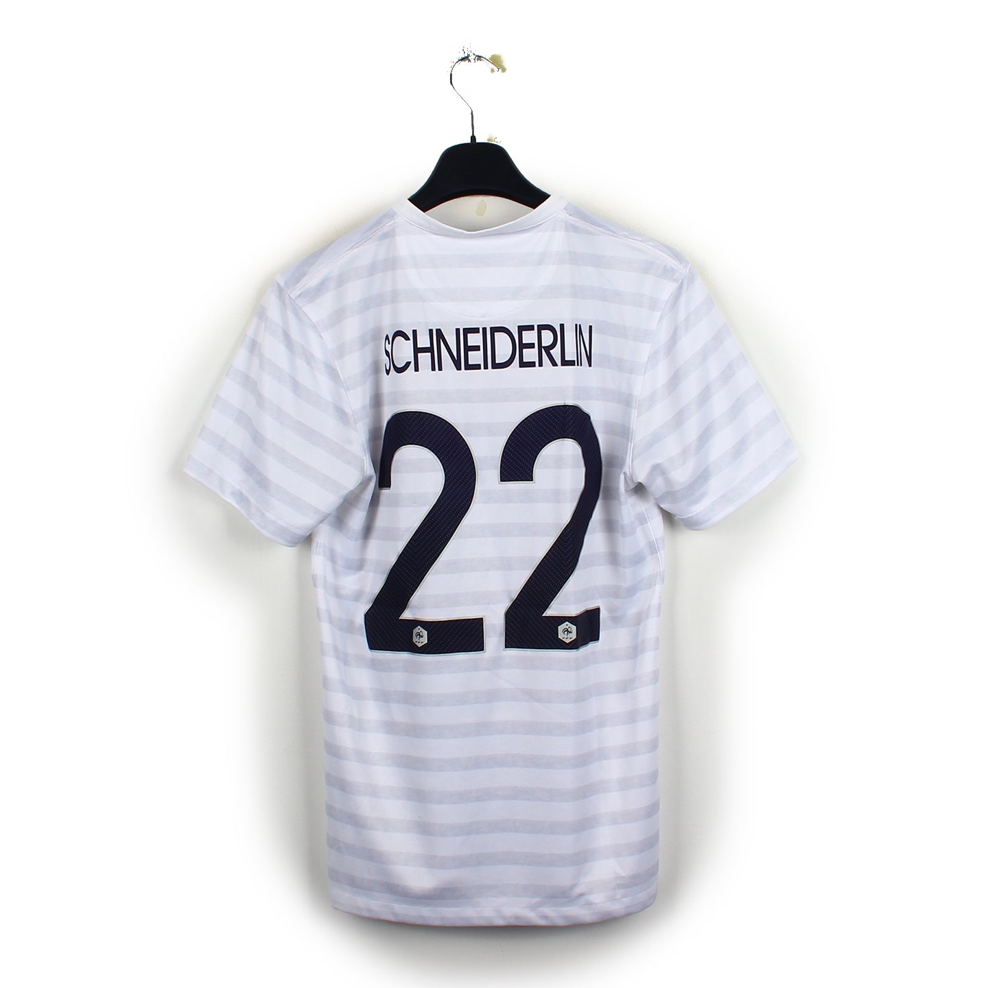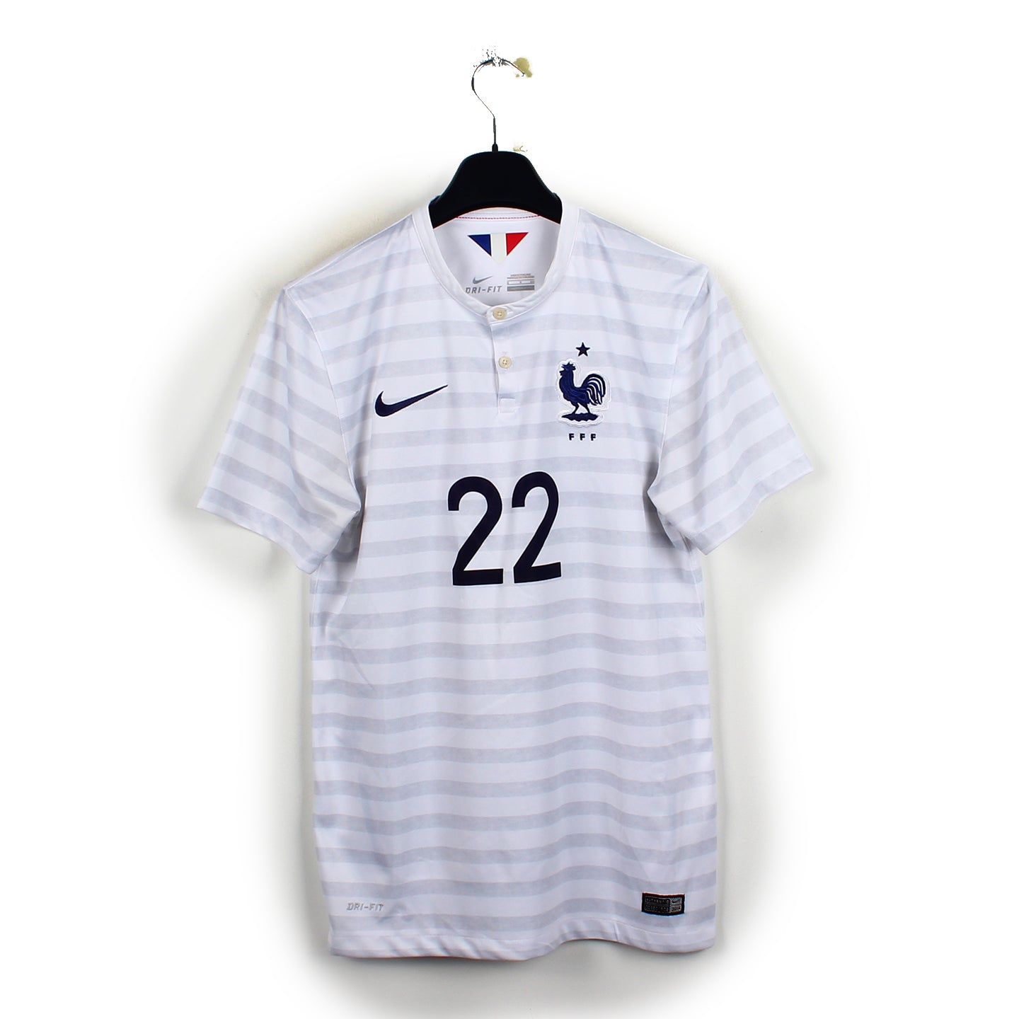 Histoire : Maillot extérieur porté par les français lors de la Coupe du Monde 2014. Sous les ordres de Didier Deschamps, les français feront des prestations plus que convaincantes avant de tomber sur le futur champion du monde allemand en s'inclinant 1-0 en quarts de finale.