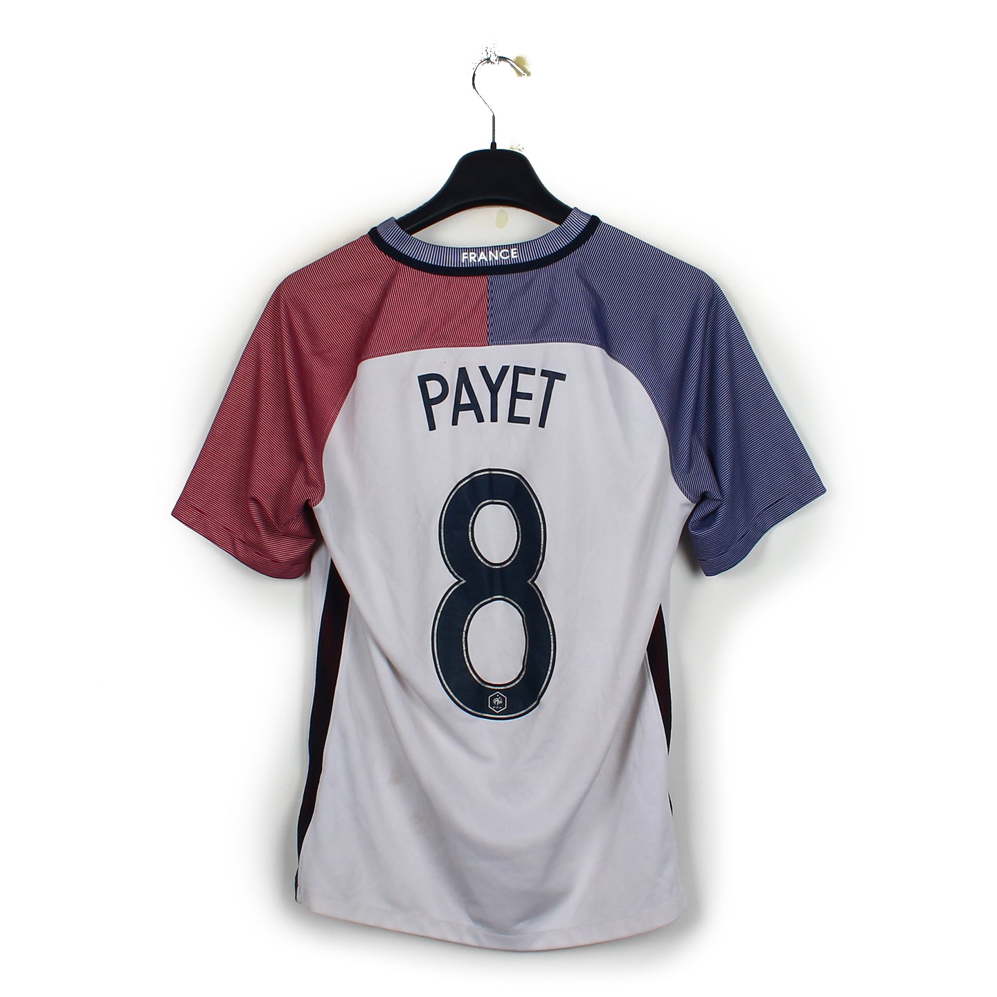 Histoire : Maillot extérieur porté par les Bleus durant l'Euro 2016, organisé en France. Les hommes de Didier Deschamps parviendront à se hisser en finale de la compétition, finale perdue face aux Portugal (0-1).