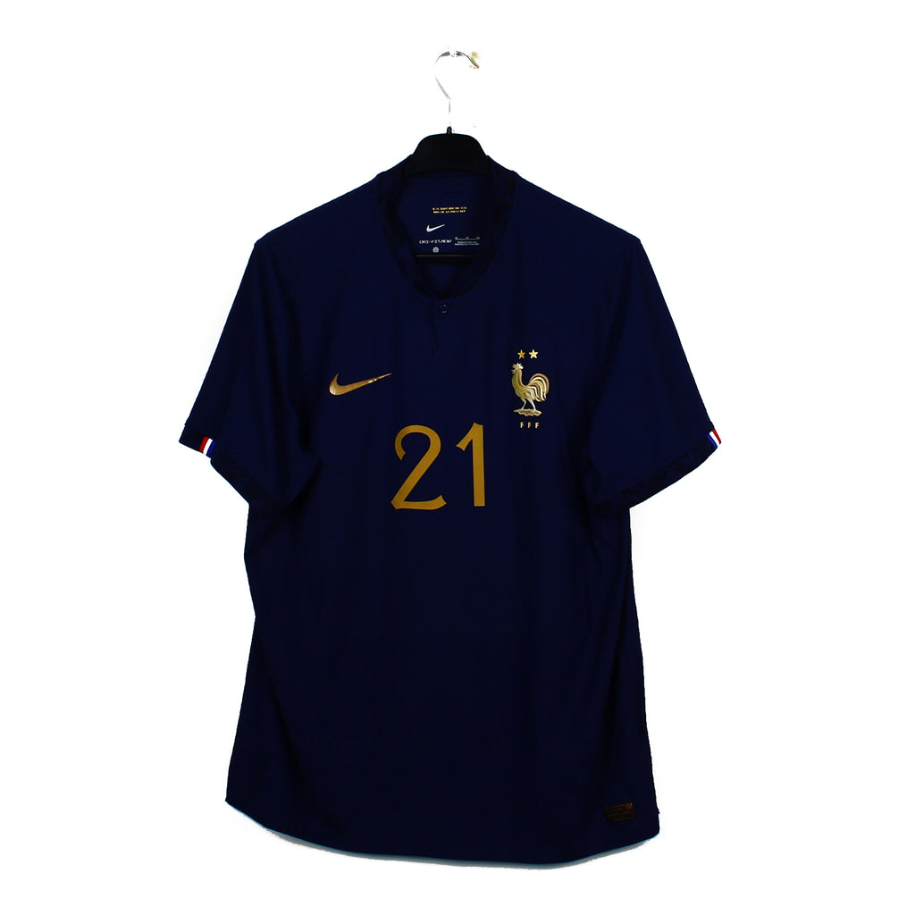 Histoire : Maillot domicile porté lors de la Coupe du Monde 2022 où les Bleus seront vaincus par l'Argentine de Leo Messi aux tirs au but après une rencontre historique.