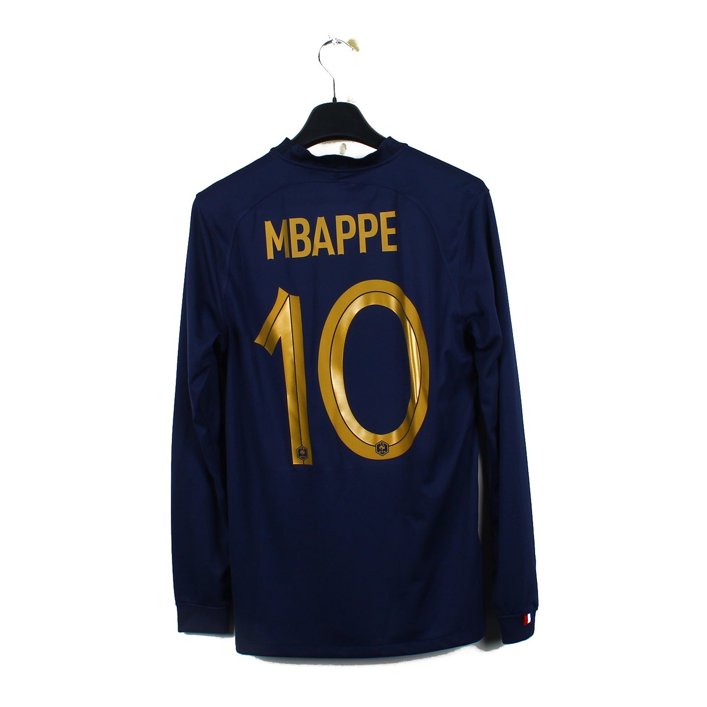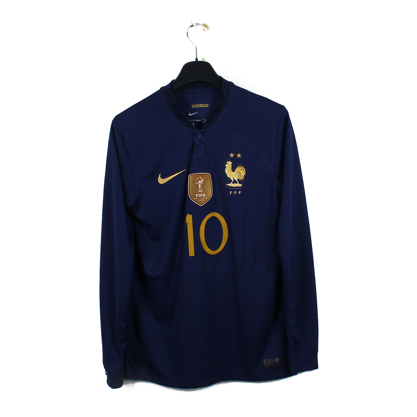 Histoire : Maillot domicile porté lors de la Coupe du Monde 2022 où les Bleus seront vaincus par l'Argentine de Leo Messi aux tirs au but après une rencontre historique.