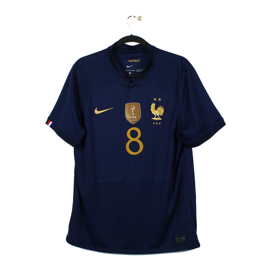 Histoire : Maillot domicile porté lors de la Coupe du Monde 2022 où les Bleus seront vaincus par l'Argentine de Leo Messi aux tirs au but après une rencontre historique.