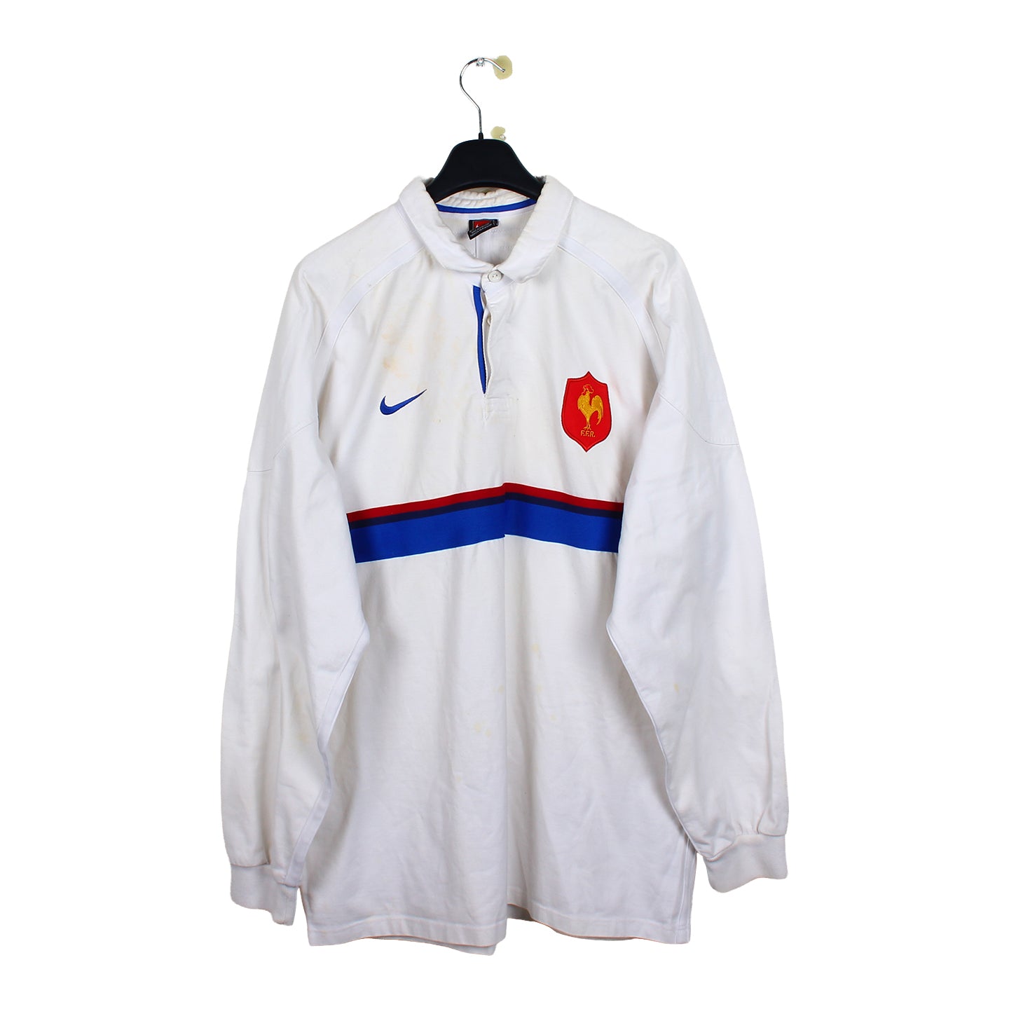 Histoire : Maillot domicile porté par l'équipe de France de rugby lors de la coupe du Monde 1999 où elle sera vaincue en finale par l'Australie. Mais on retiendra surtout la demi finale, les français affronteront les All Blacks pour un match légendaire. Une victoire 43-31 pour les Bleus, un des plus grands exploit du rugby français que l'on appellera "Miracle de Twickenham".