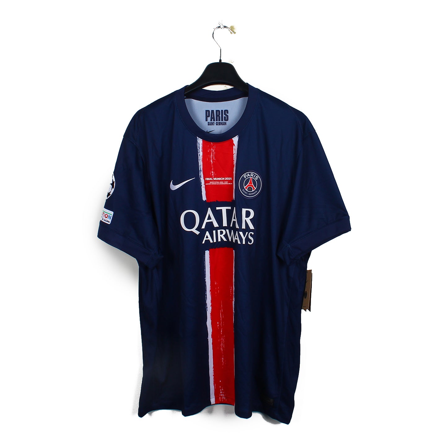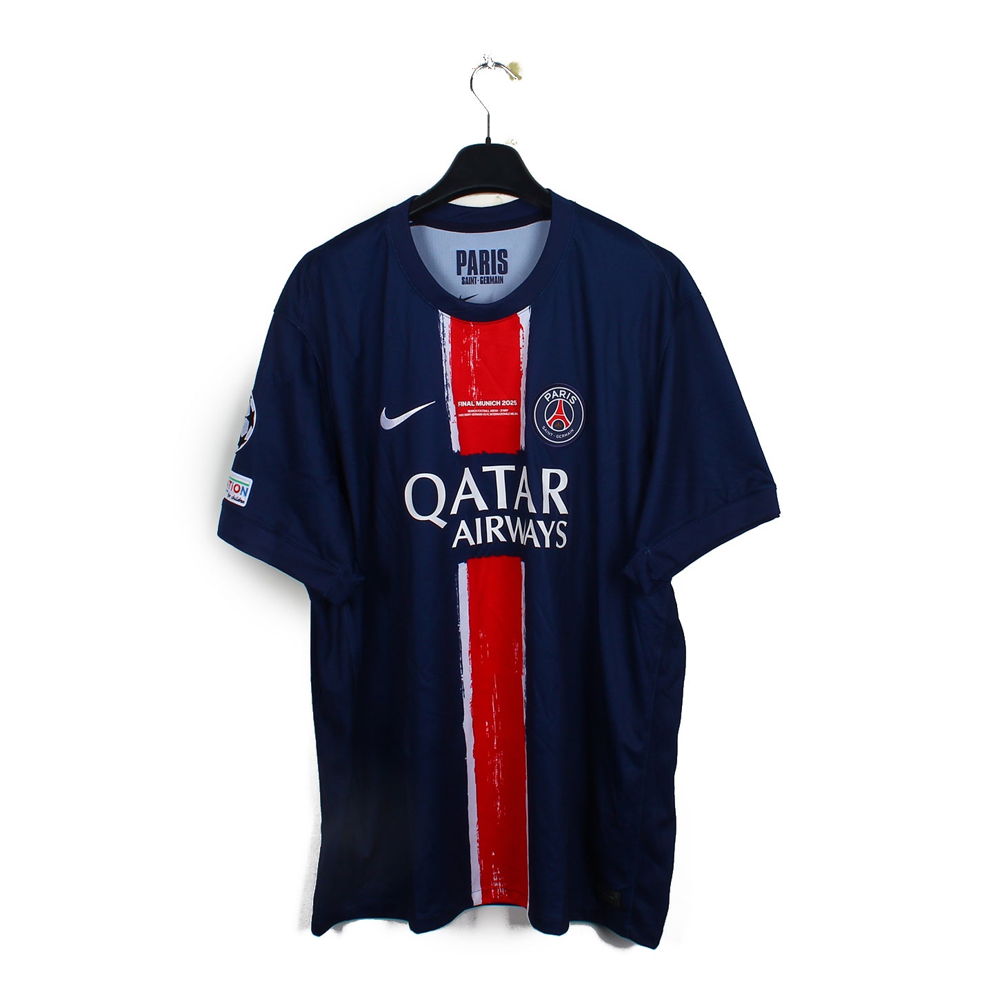 Histoire : Maillot domicile porté par les parisiens lors d'une saison exceptionnelle, où ils remporteront la Champions League, en terrassant l'Inter (5-0). Ils feront le doublé Coupe/Championnat.