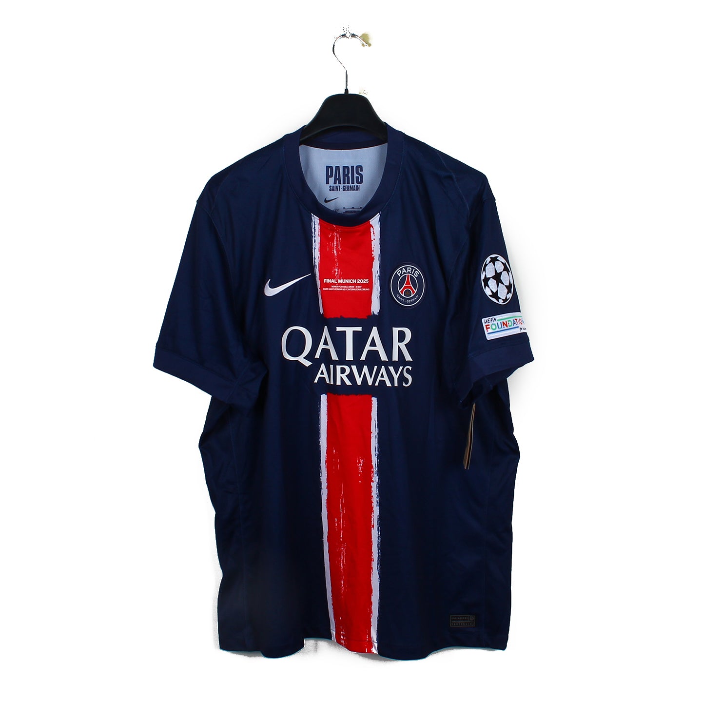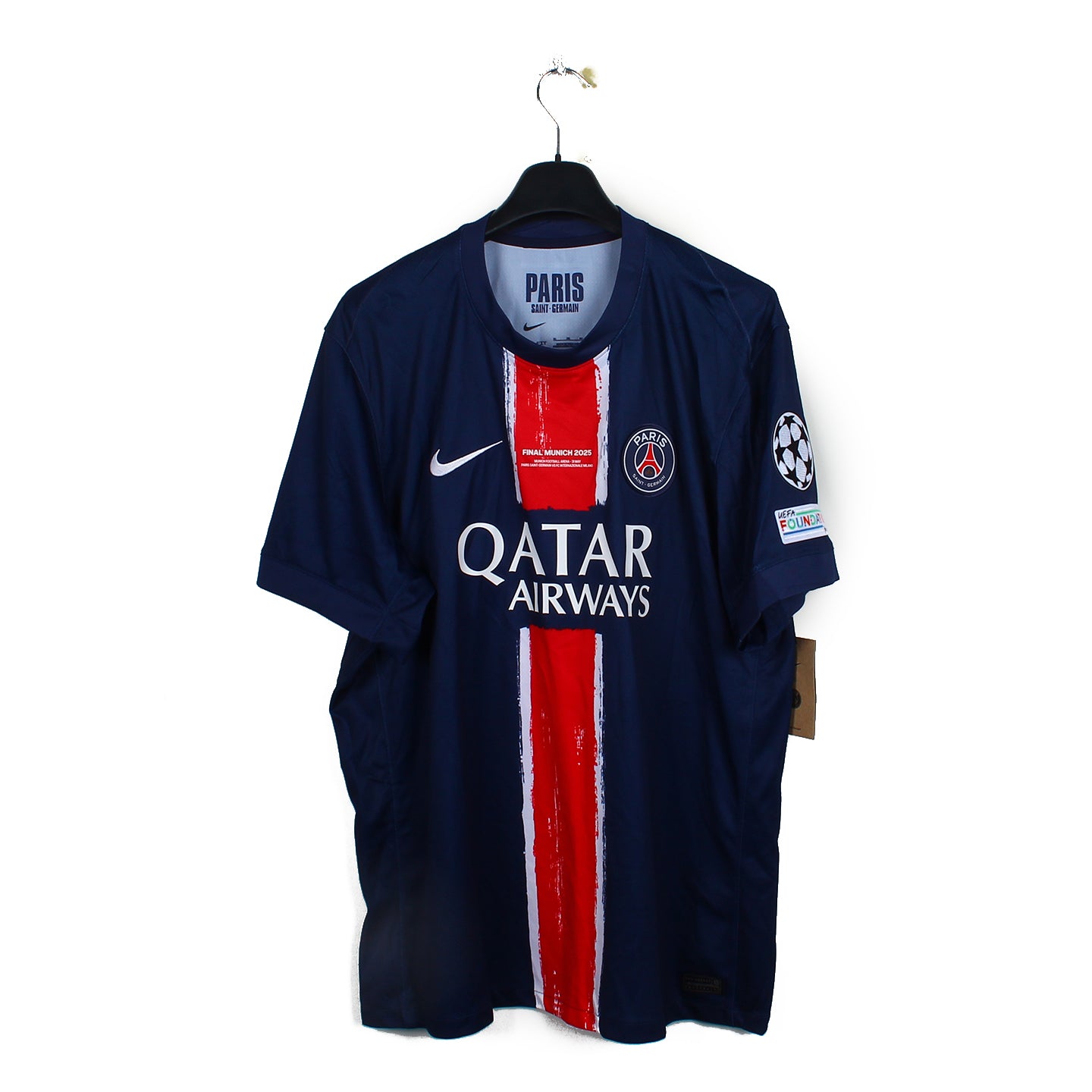 Histoire : Maillot domicile porté par les parisiens lors d'une saison exceptionnelle, où ils remporteront la Champions League, en terrassant l'Inter (5-0). Ils feront le doublé Coupe/Championnat.