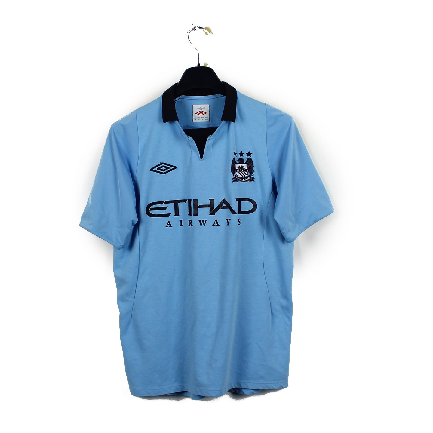 Histoire : Maillot domicile porté par les Citizens lors de la dernière saison de Roberto Mancini au club. Les coéquipiers de Tevez ne parviendront pas à conserver leur titre en championnat, terminant à onze points du champion United.