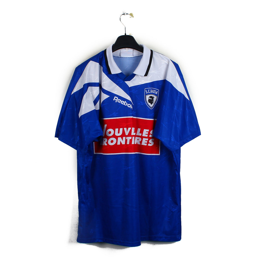 Histoire : Maillot porté par les Corses durant deux saisons. Le club terminera le championnat avec un total de 44 points, sécurisant une 15ème place synonyme de maintien dans l'élite du football français autrefois appelée la Division 1. Un certain Zinédine Zidane sera élu meilleur joueur du championnat lors de cette saison. La seconde saison sera bien plus tranquille avec une 7ème place et un Anto Drobnjak à 18 buts.