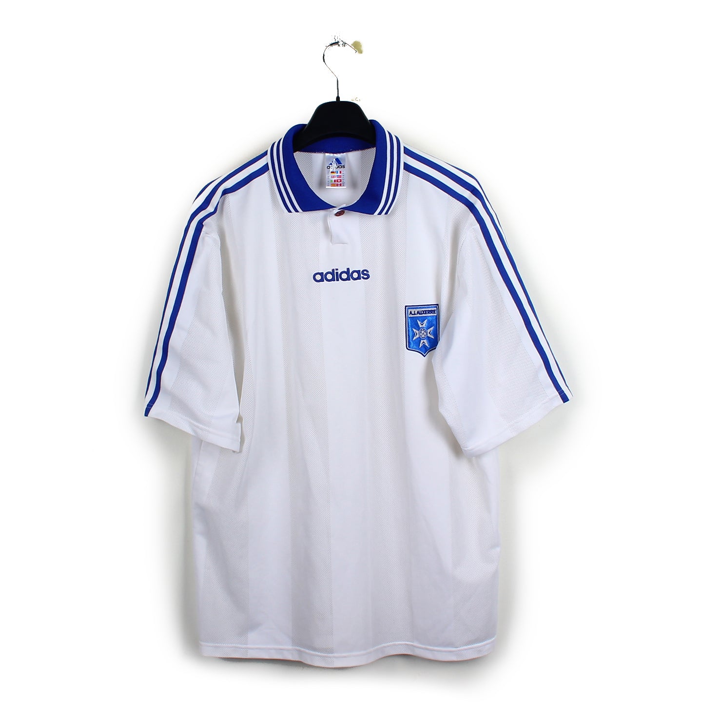 Histoire: Maillot domicile porté par les auxerrois sous les ordres de Guy Roux. Ses hommes finiront 7ème malgré un Stéphane Guivarc'h en feu, 21 buts en championnat et meilleur buteur de la première division !