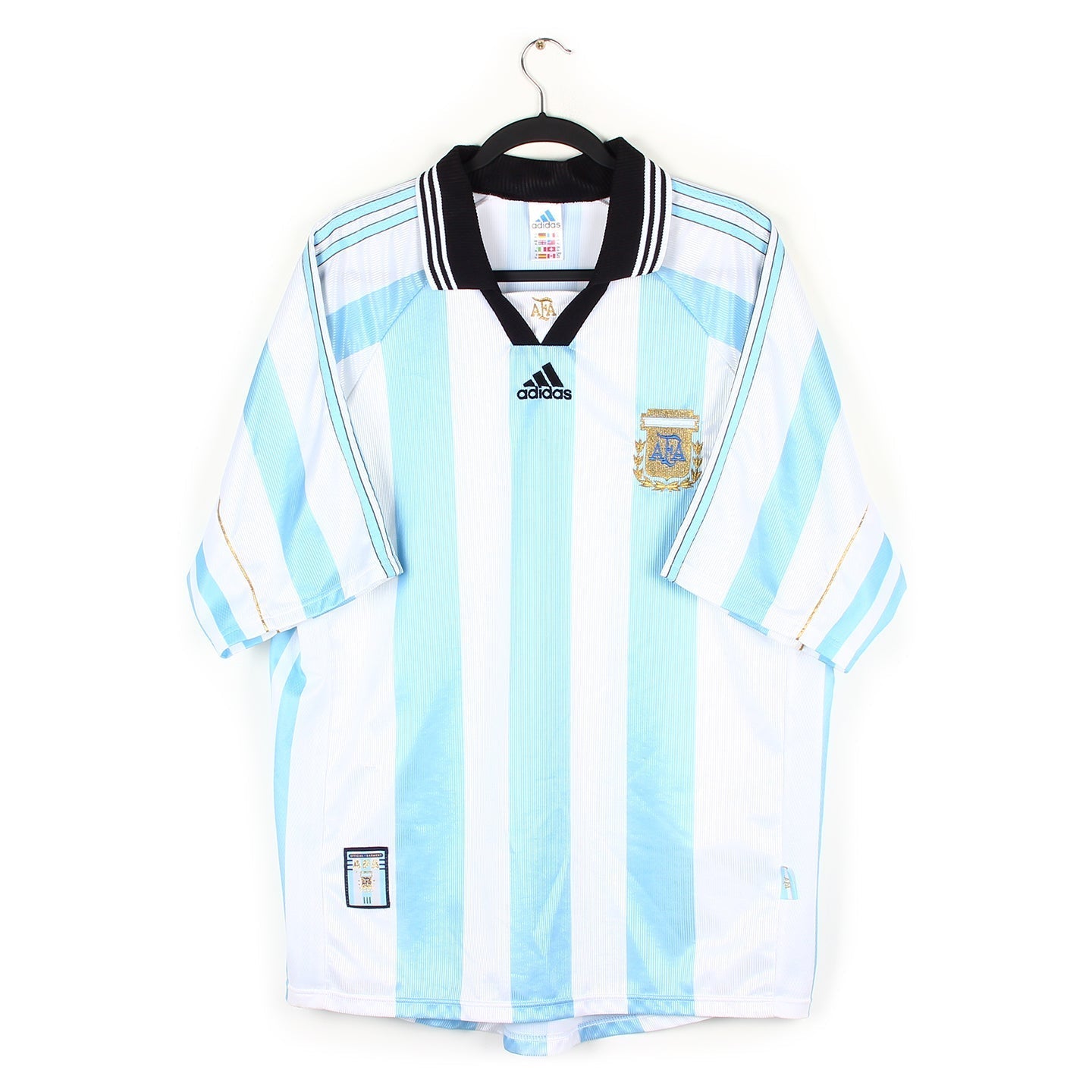 Histoire : Ce maillot domicile sera porté par l'Argentine lors de la coupe du monde 1998 sur le sol français. Après une phase de poule maitrisée, les coéquipiers à Simeon stopperont leur aventure en quart de finale lors d'un match au vélodrome face aux néerlandais (2-1).