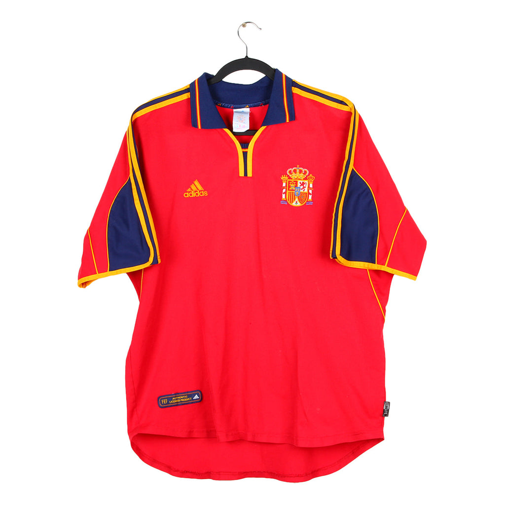 Histoire : Maillot domicile porté par la Roja lors du l'Euro 2000 organisé entre les Pays-Bas et la Belgique. La sélection alors dirigée par Camacho atteindra les quarts de finale avant d'être éliminée par les futurs champions Français sur des buts de Zidane et Djorkaeff.