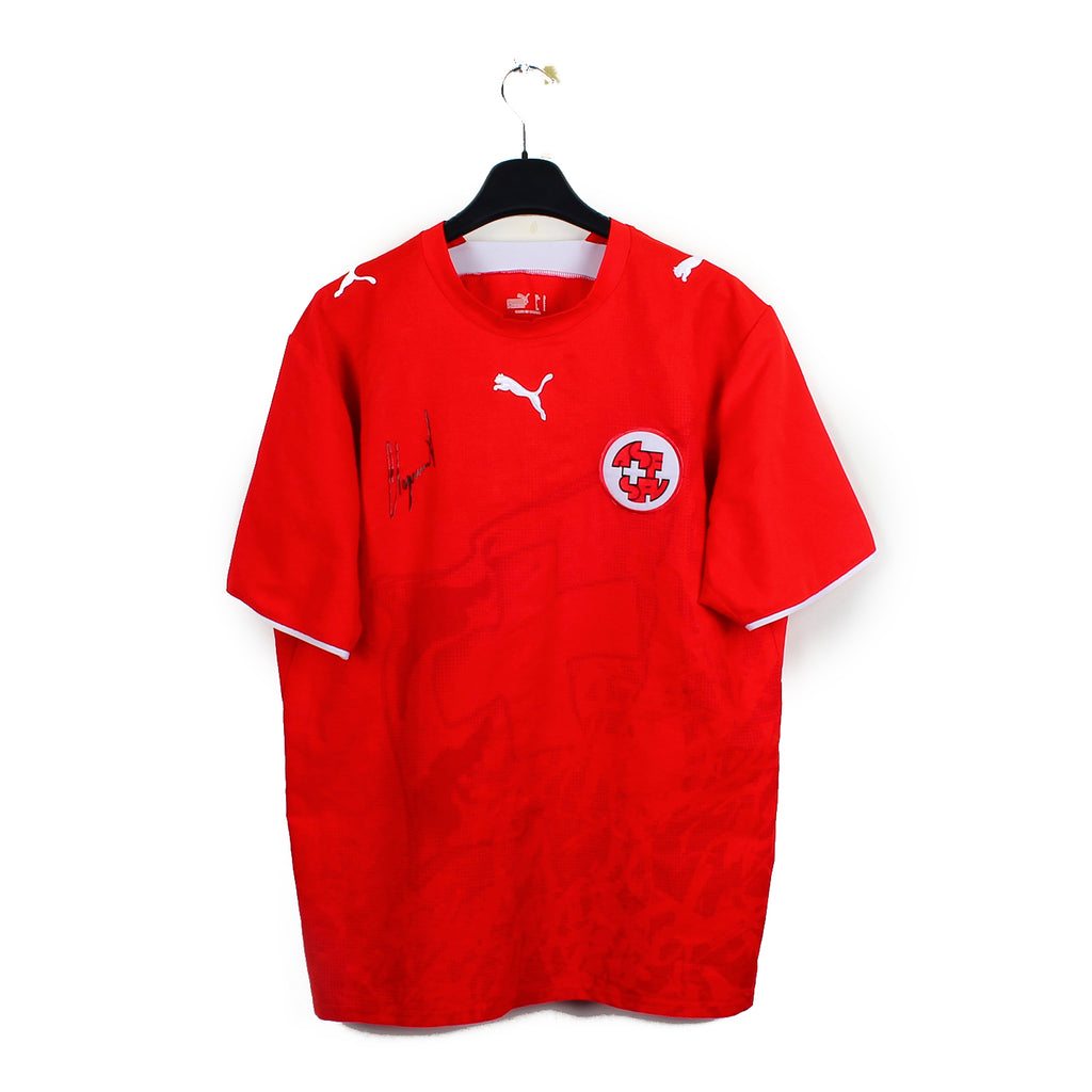 Histoire : Maillot domicile porté par les Suisse lors de la Coupe du Monde 2006. Le portier Zuberbühler gardera sa cage inviolée tout la compétition, ce qui n'empêchera pas une élimination en huitièmes de finale aux tirs au but face à l'Ukraine.