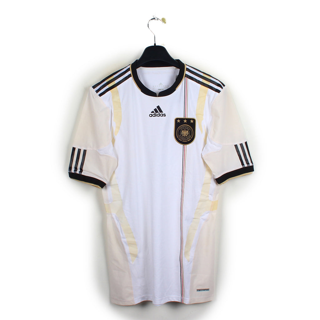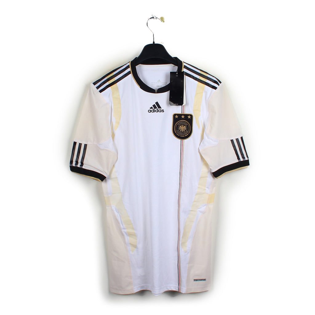 Histoire : Maillot domicile porté par le Mannschaft durant la Coupe du Monde 2010 organisée en Afrique du Sud. Malgré une défaite face à la Serbie en groupe, les Allemands termineront premier de leur groupe, leur permettant l'accès aux phases à élimination directe. Le parcours de la sélection du capitaine Lahm se terminera en demi-finale, battue 1-0 par les futurs champions Espagnoles.