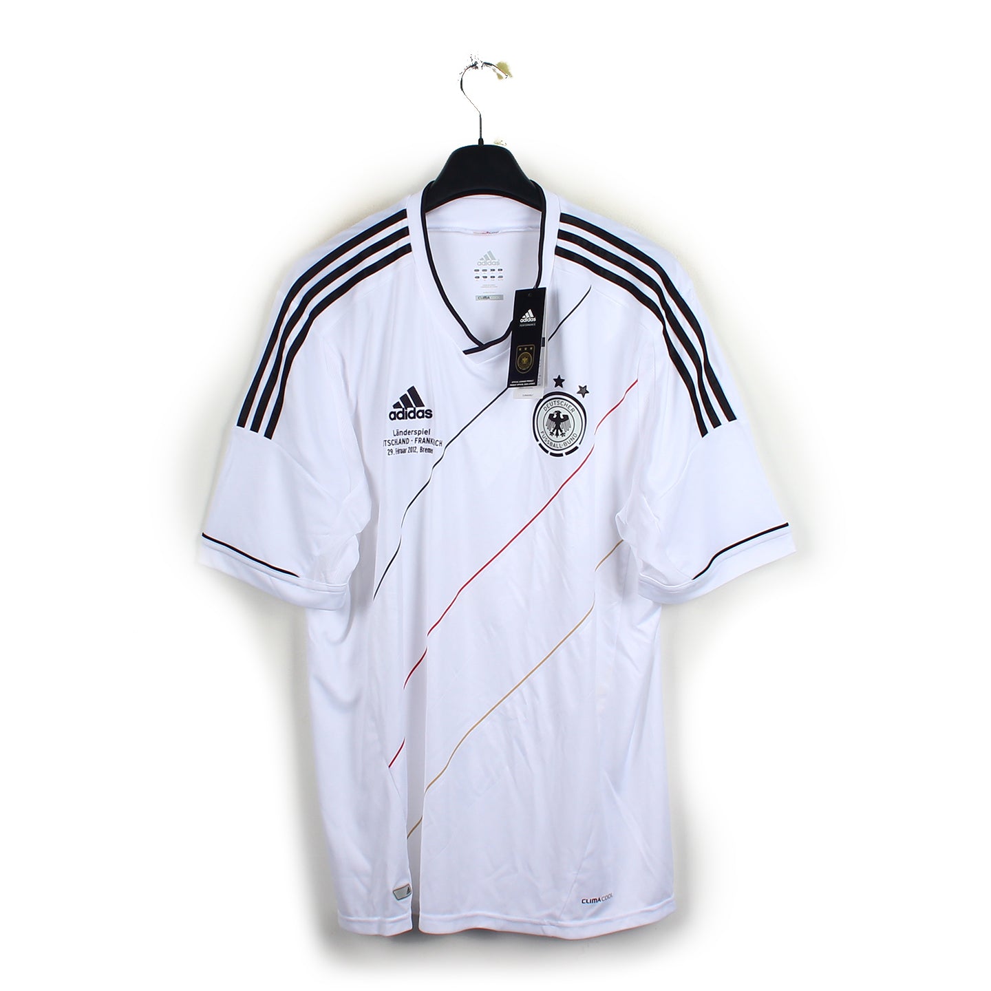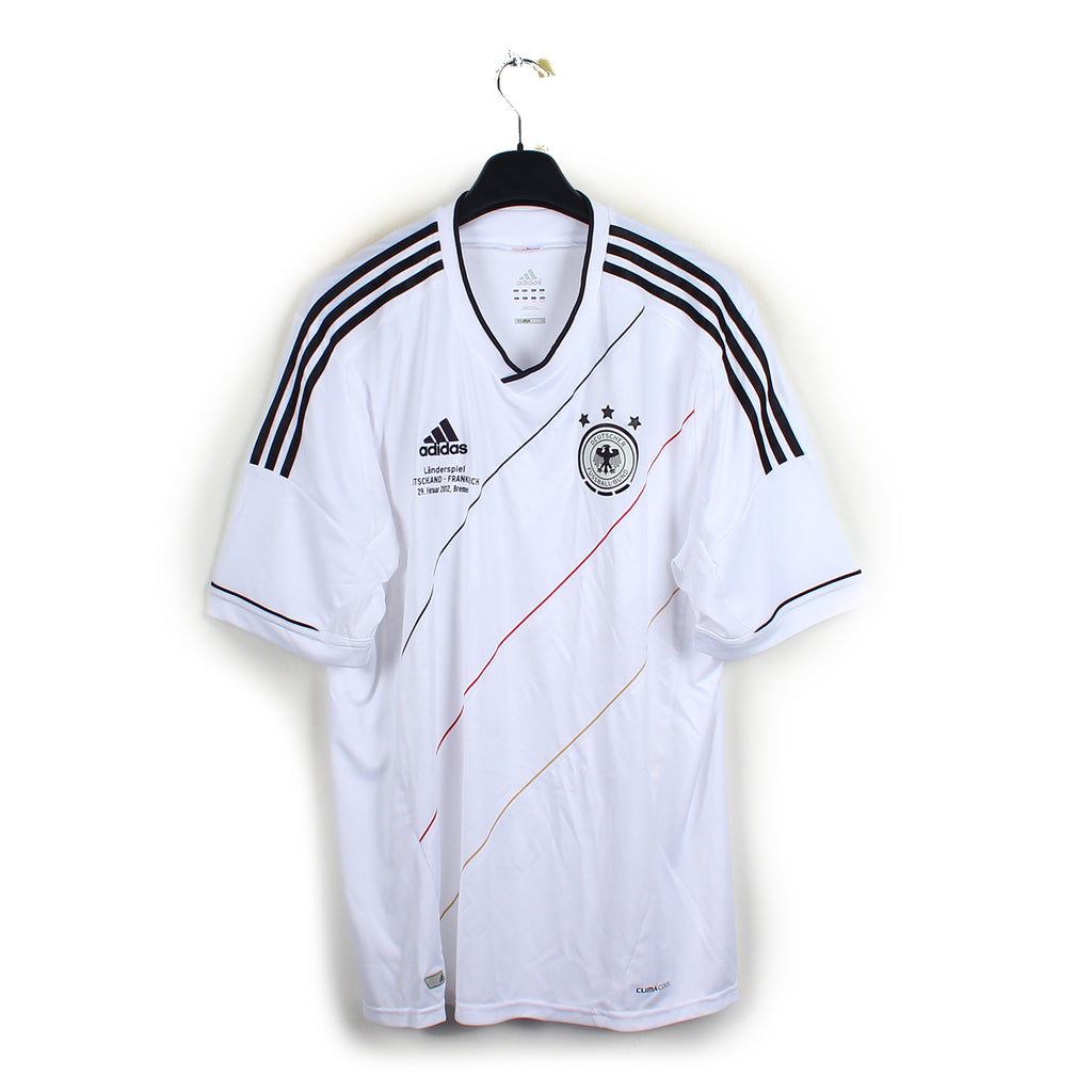 La pièce en détail : Maillot neuf avec étiquettes. Rencontre Allemagne vs France floquée sous le logo Adidas.