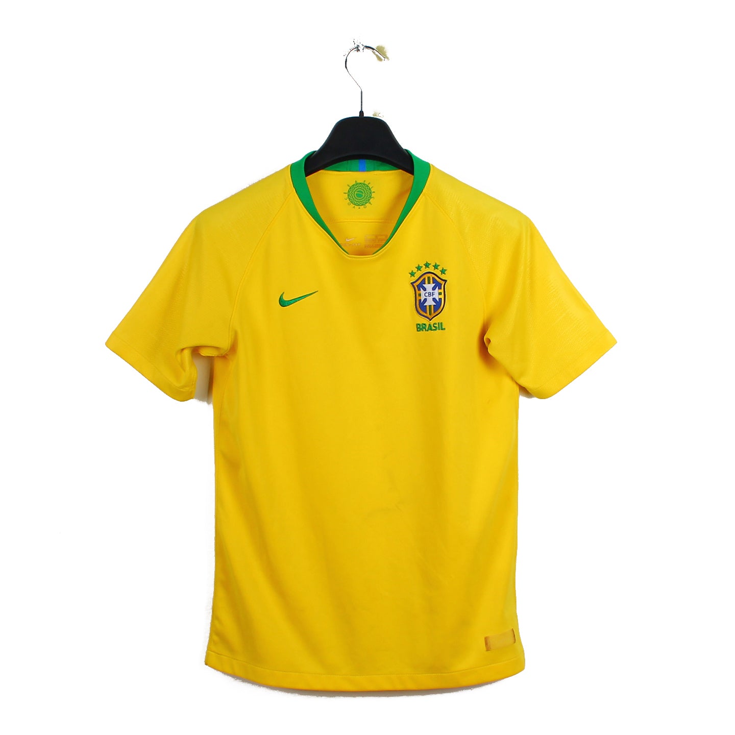 Histoire : Maillot domicile porté les brésiliens lors de la Coupe du Monde 2018, édition où les coéquipiers de Neymar iront jusqu'en quart de finale, éliminés 2-1 par l'excellente Belgique.